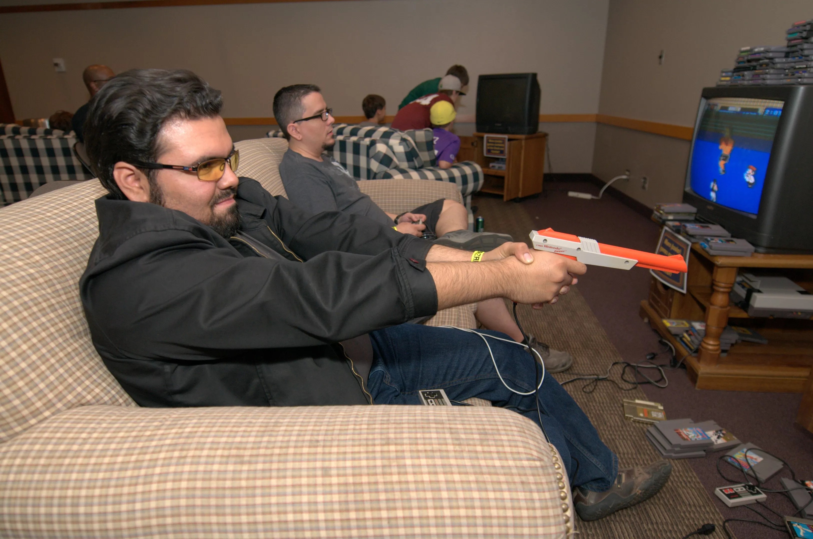 Taking aim with the NES Zapper in the lounge at last year’s ZapCon.