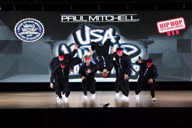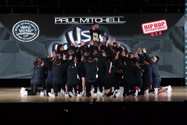 The Jukebox Family, of Jukebox Dance Studio, in Mesa, Ariz., take the stage in the mega-crew division of Hip Hop International, in Phoenix.