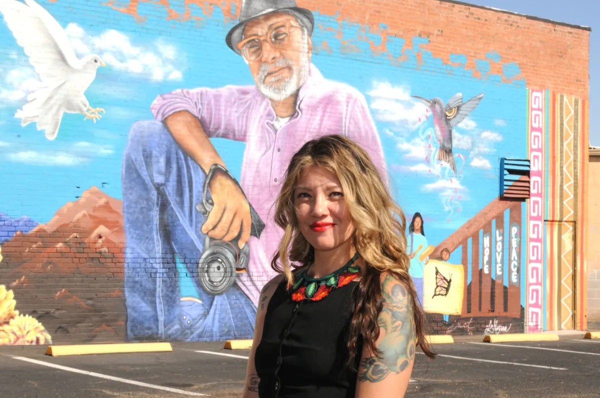 Diane Ovalle stands in front of the mural on a spring day when the only clouds in the desert sky are painted like floating wings alongside a larger than life image of photojournalist Nick Oza.