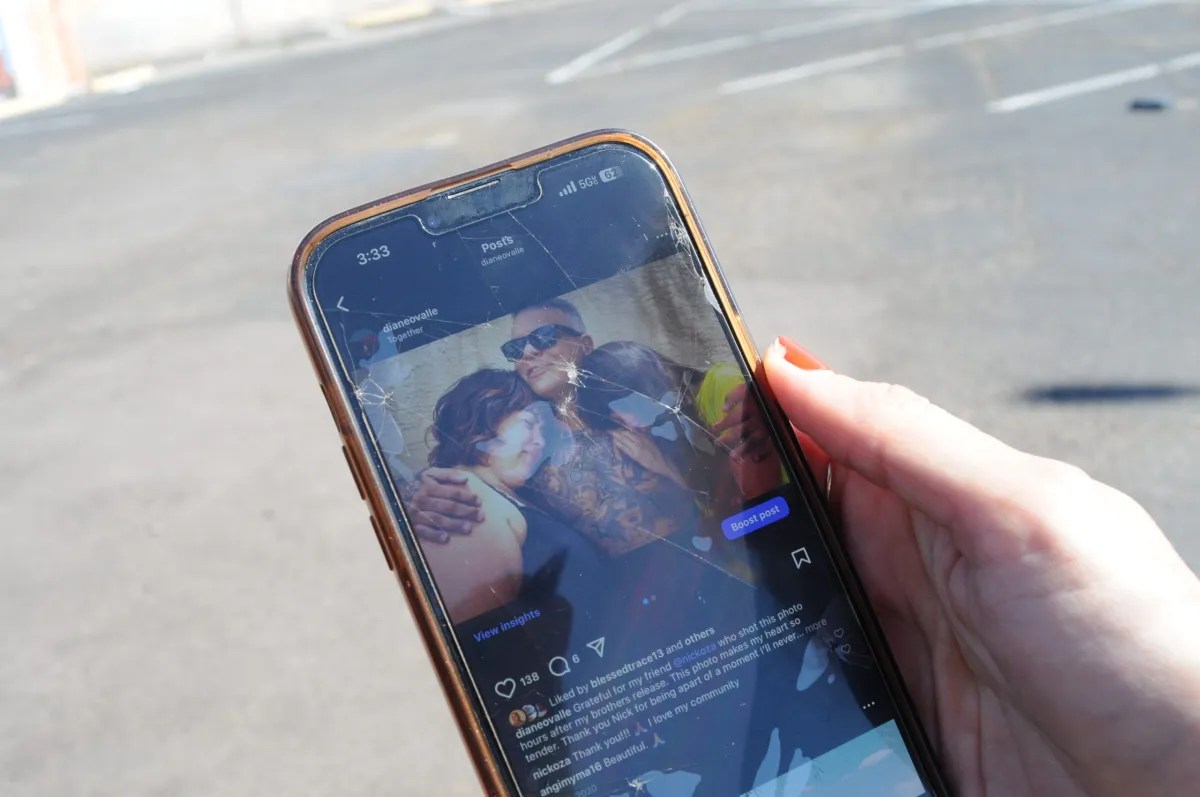 Diane Ovalle holds her cellphone and shows the photo Nick Oza took of her brother the day he was released from prison after a 15-year sentence.