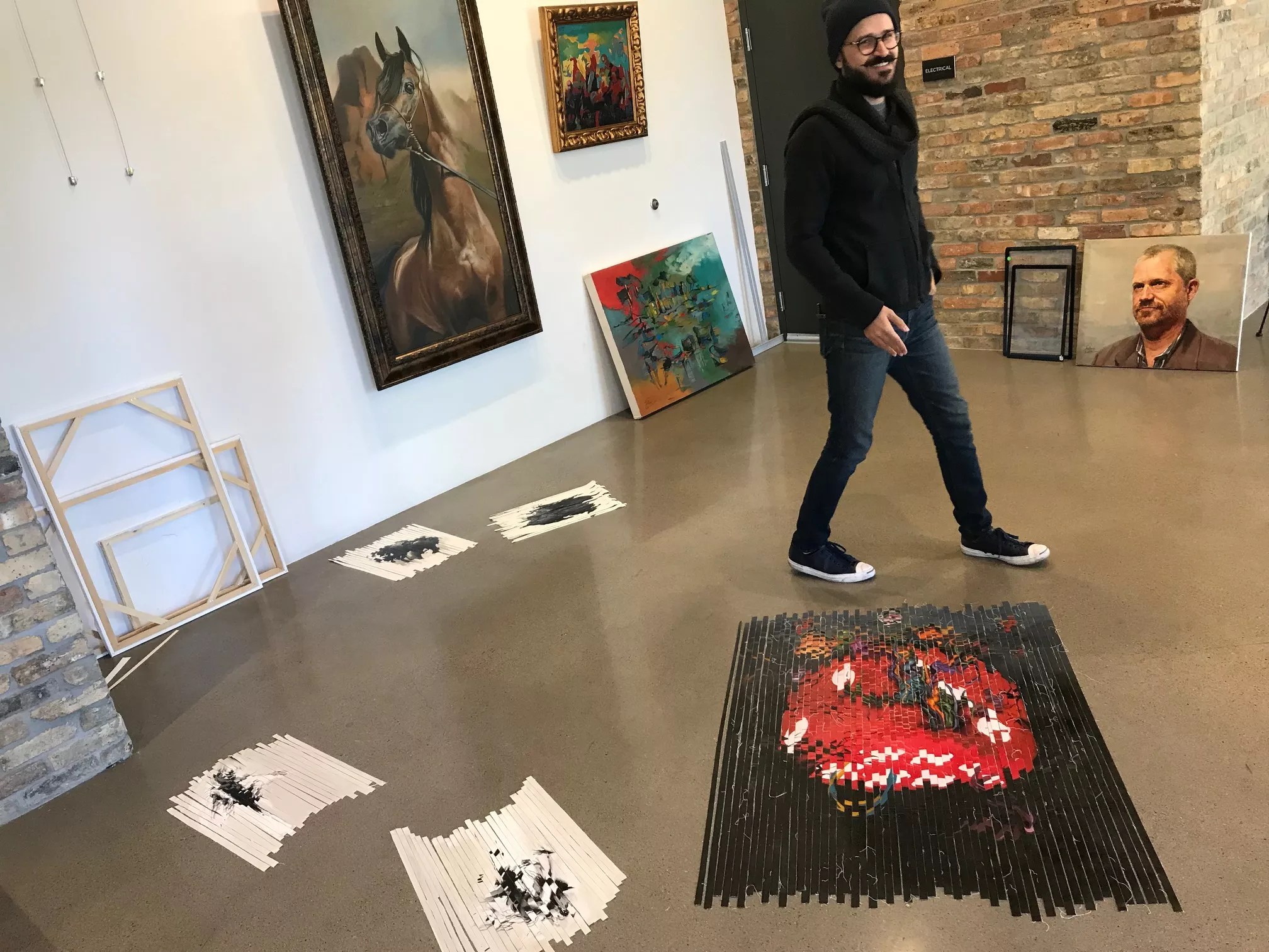 Today, the artist is busy with finishing touches like adding gallery lighting, and getting artworks ready to hang. They’ll include pieces by students who’ve studied art with Al-Shaker in recent years. He’s wondering whether to preview a new series of his own work, comprising painted canvases cut into strips set slightly askew atop gallery floors, knowing they could be overrun by First Friday crowds.
