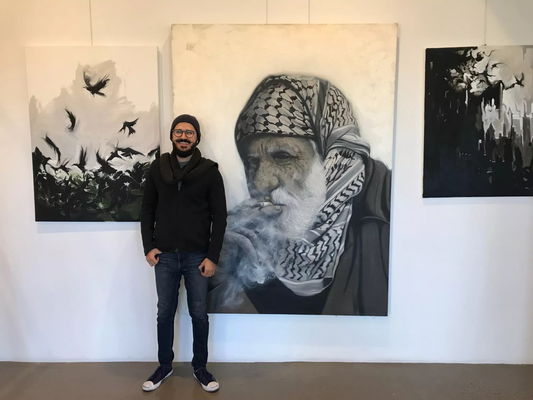 Bassim Al-Shaker with several of his works inside Green Leaf gallery.