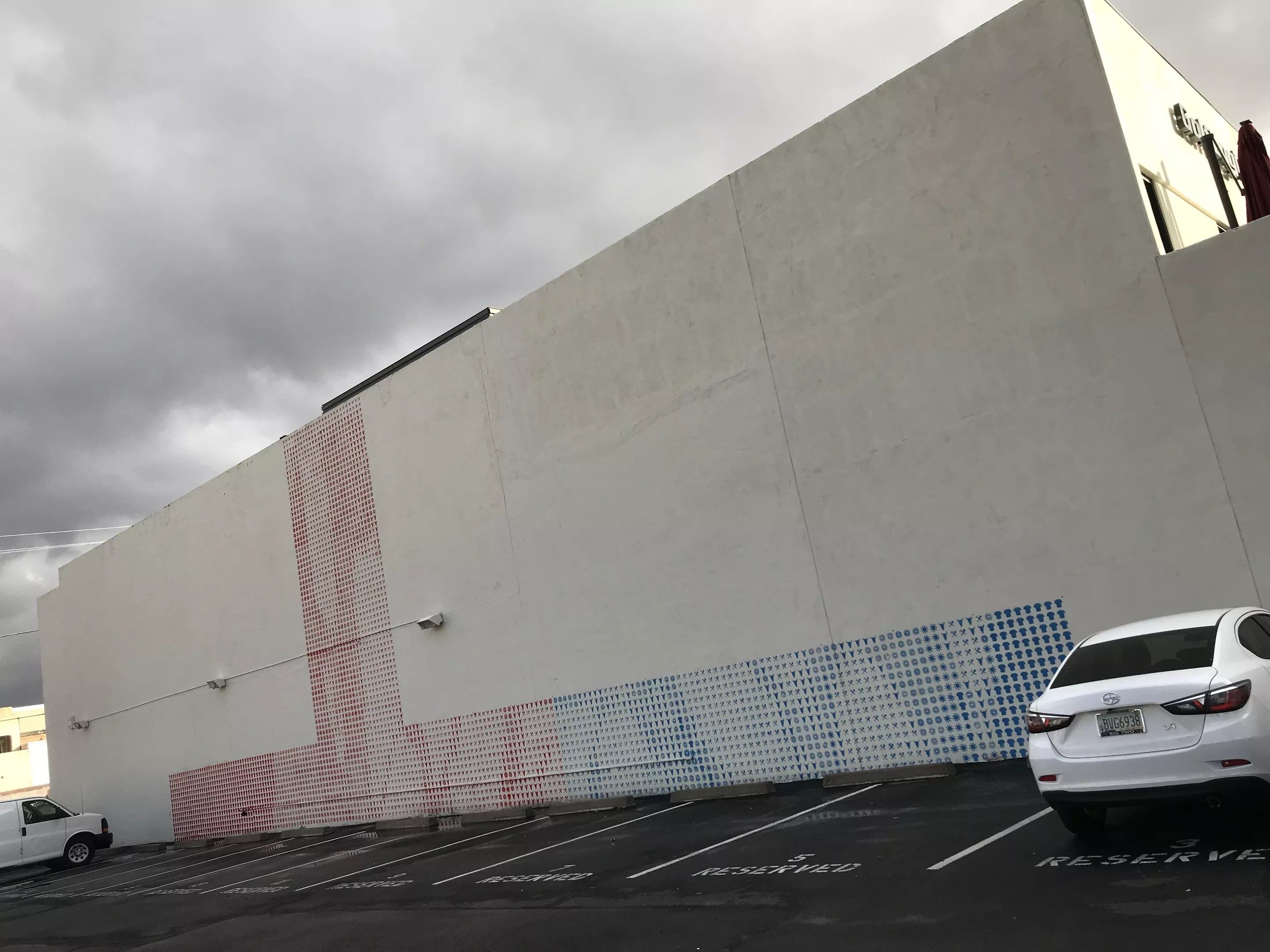 Adjacent to the wall is a parking lot owned by Dewey Schade, who has voiced strong opposition to the artwork. Bass can’t stand in front of the wall and paint without stepping on Schade’s property. He’s tried painting using machinery that elevates him off the ground, but Schade considers that trespassing, and he’s not alone.