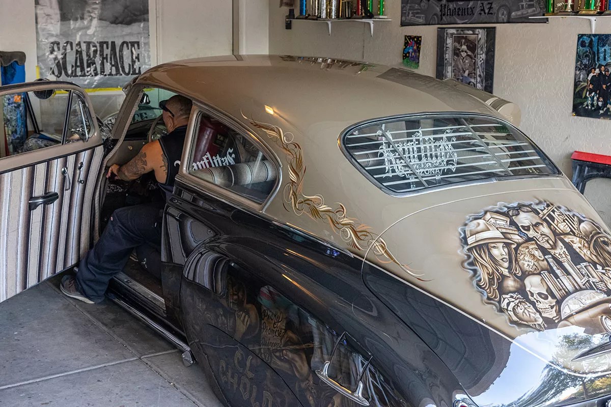 “Your car tells your story, so you don’t have to come up with the words,” says Tony, who says personalized lowrider murals started getting popular in the ’70s. “Me, I’ve got a 1950 Fleetline, slow and low, and it’s where I got all my stories. There was a time in my life when I was feeling kind of down, but instead of doing drugs to feel better like some people do, I came into the garage and painted all my feelings on my car.”