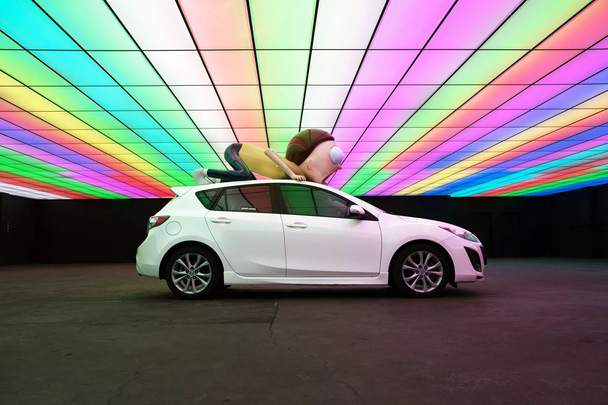 If you’re in the vicinity of the Alamo Drafthouse Cinema Chandler, located at 4955 South Arizona Avenue in Chandler, on Friday, January 17, from noon to 2 p.m., you can post a shot of yourself next to the 2010 Crystal White Pearl Mica Mazda 3 with a fiberglass replica of the teenage cartoon character on the top. It was introduced at the Adult Swim Festival in Los Angeles late last year.