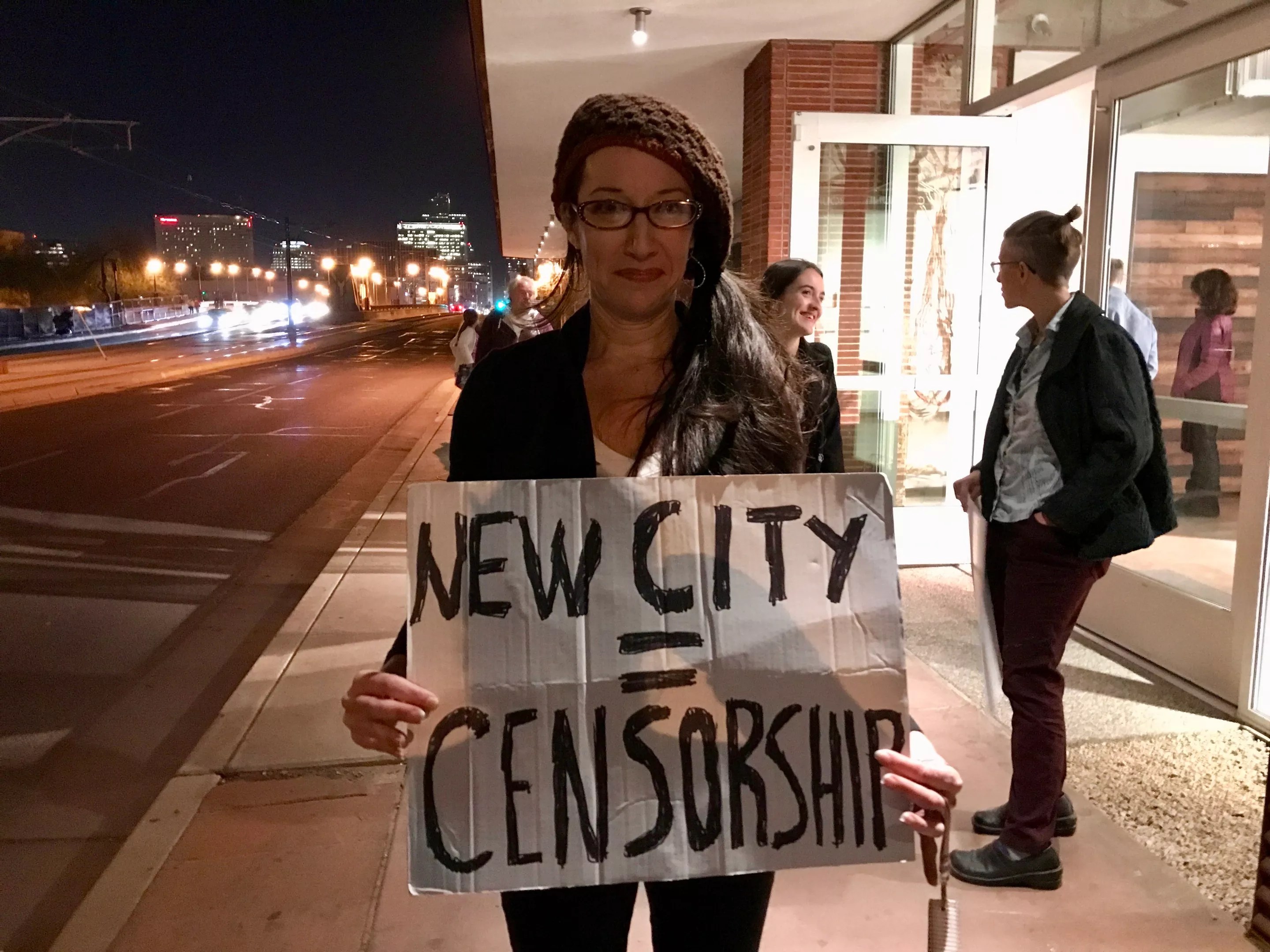 The protesters held signs decrying censorship, and stood near the east entrance to the gallery, located on Central Avenue. When they talked with Phoenix New Times that night, they also expressed concerns about New City Church’s stance on LGBTQ issues.