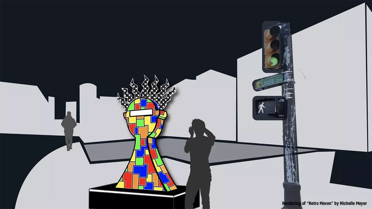 Her design features an abstract human form, which she’ll create with an intriguing mix of materials including mirrors and lights. For the head, she found inspiration in the holographic effects of the metal used to make street signs. For the hair, she’ll incorporate an optical illusion called the moiré effect. “For the bright colors,” Meyer says, “I drew on visual styles from Tetris, disco, and pop art.”