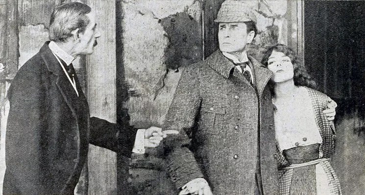 Frankenstein Panel Discussion A publicity still of Sherlock Holmes in the July 1916 edition of Moving Picture World, an early trade journal for the American film industry. By Unknown – Internet Archive, Public Domain