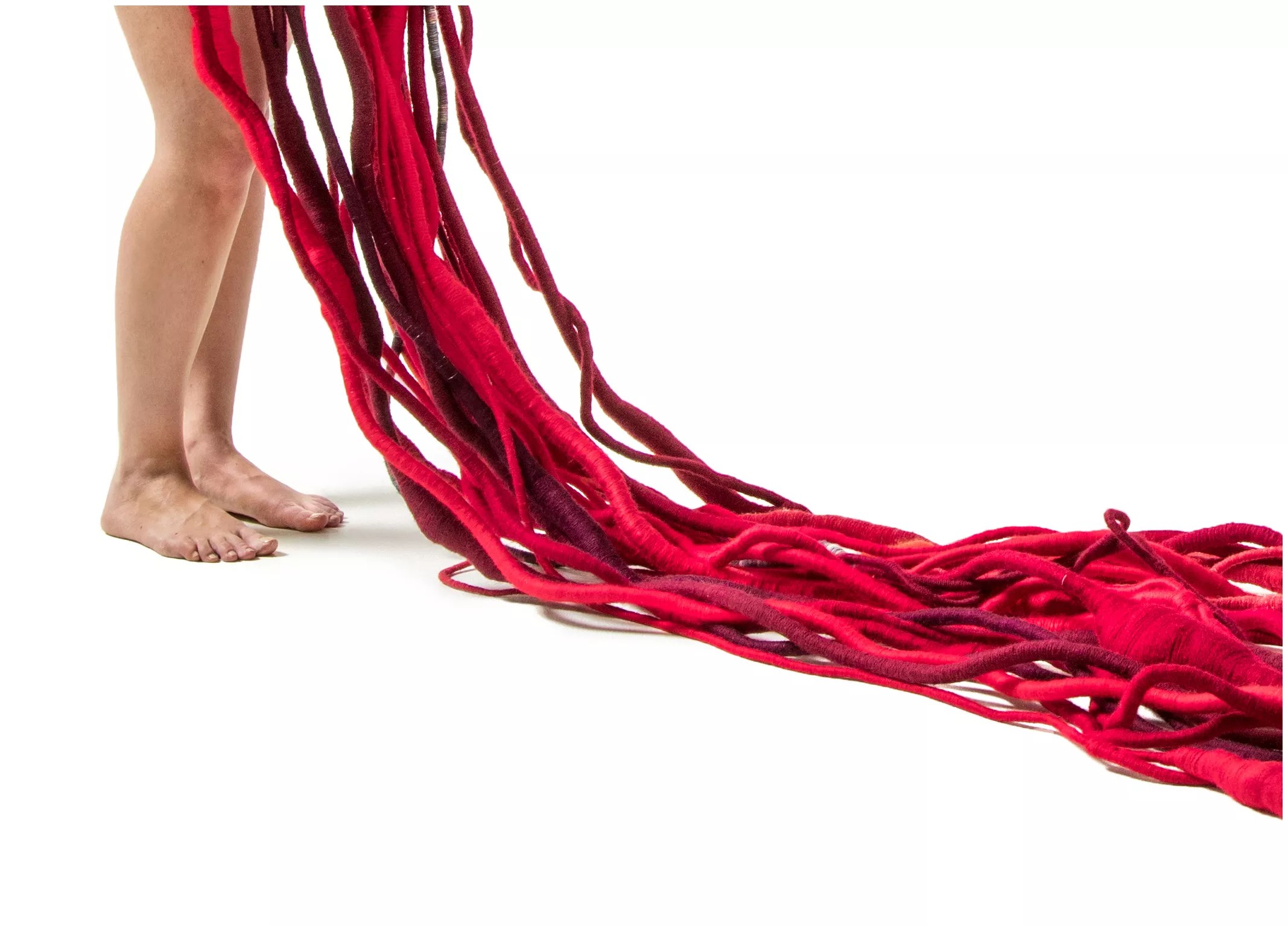 “Lineage” is anchored by an 18-foot-long burst of red that prompts reflection on the complexities of the human circulatory system that’s essential to life, the intertwined lines of individual and collective ancestry that infuse the human experience, and the artistic lineage of Jordá’s art practice.