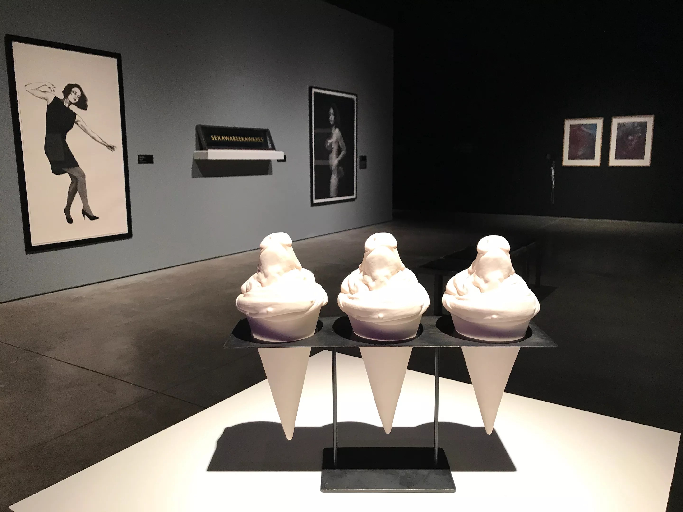 Highlights include Cheese Grid, created with more than 500 slices of American cheese by a pair of artists who call themselves The Art Guys; Colette Hosmer’s ceramic piece that sets three pigs inside waffle-style ice cream cones; and Judy Chicago drawings that fearlessly tackle what some still consider humans’ naughty parts. The show also includes lithographs by Keith Haring and James Turrell, plus Dominique Blain’s take on lipstick, a bullet, and a cigar.