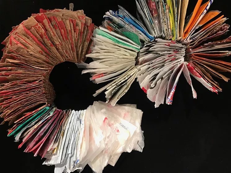 More than a dozen grad students will have work on view, and the roster will include Emily Ritter, Ryan Eckert, Hao Jiang, Monica Wapaha, Dani Godreau, and Veronica Aponte. They work in diverse media, including painting, photography, ceramics, and sculpture. And they tackle topics from recycling to colonialism. Visit the Art Group Facebook page. Lynn Trimble