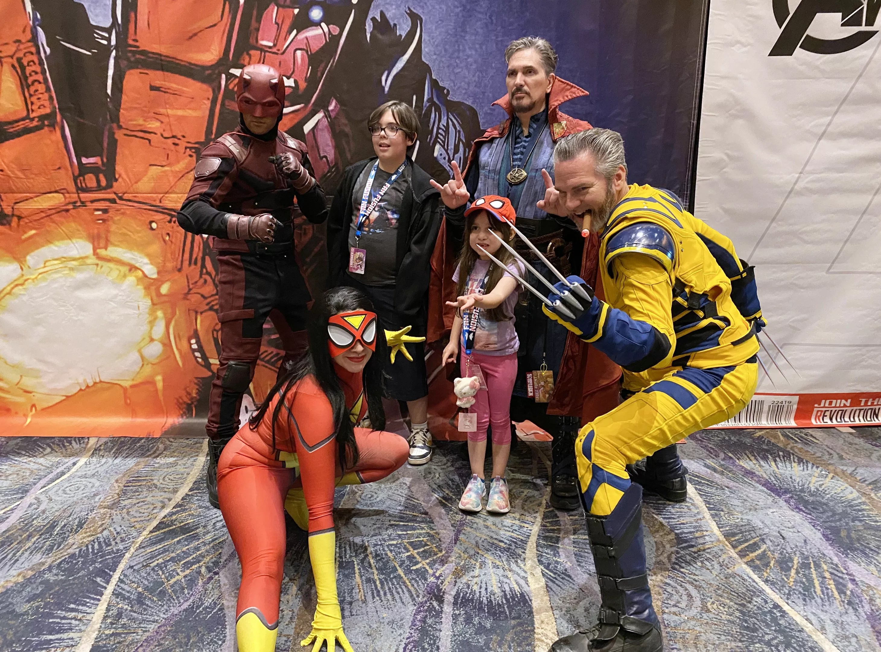 Cosplayers from the Arizona Avengers pose with a Fan Fusion attendee at their booth.