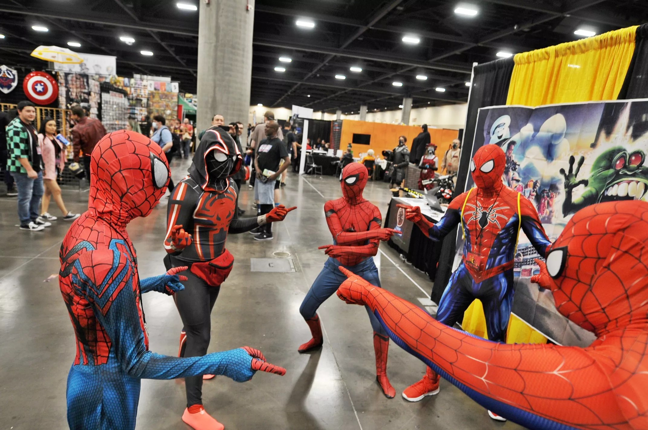 Spider-Man cosplayers reenacting an iconic meme at Phoenix Fan Fusion 2022.