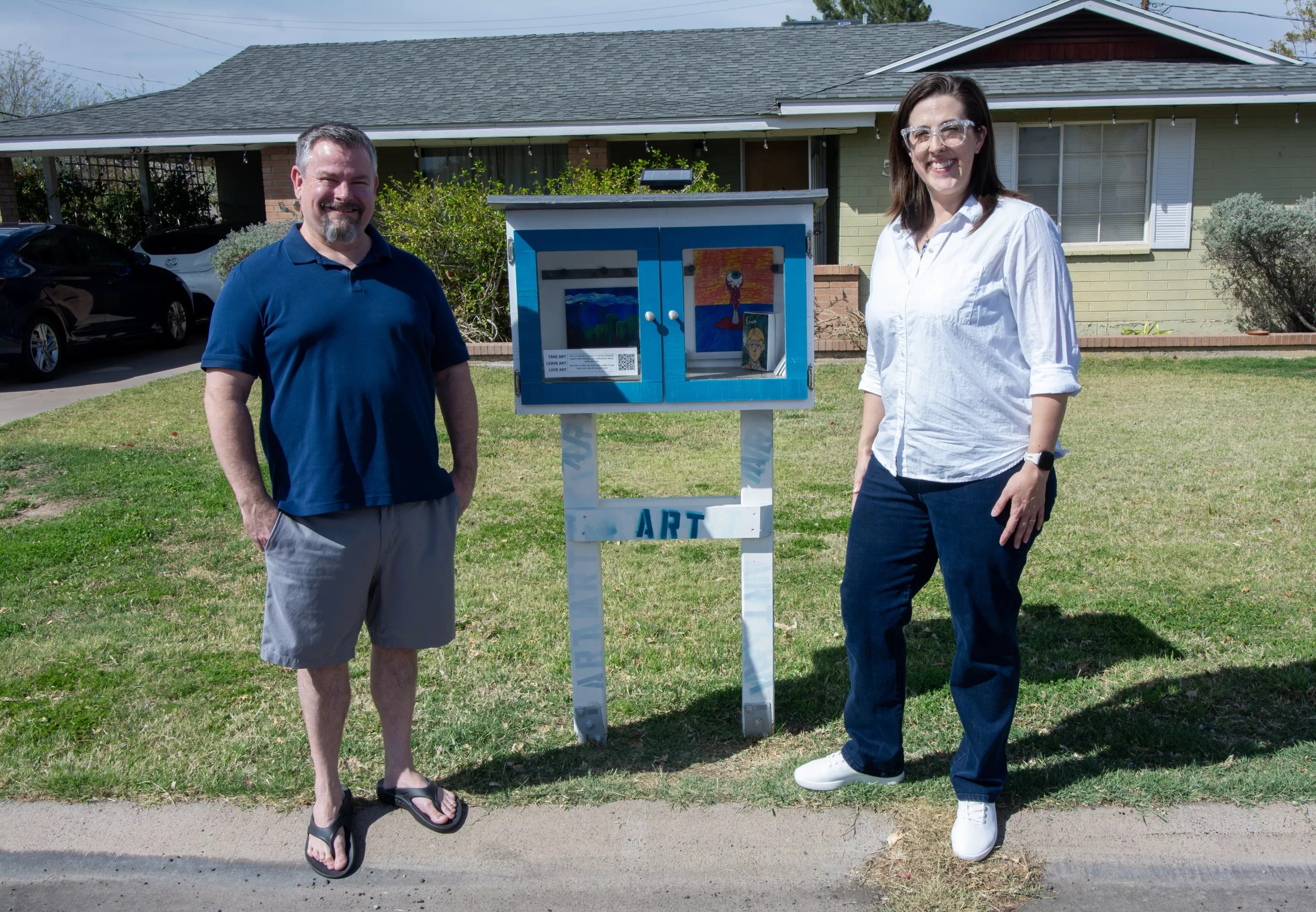 William, left, and Kayla Dobra and their Free Little Art Gallery in Tempe.