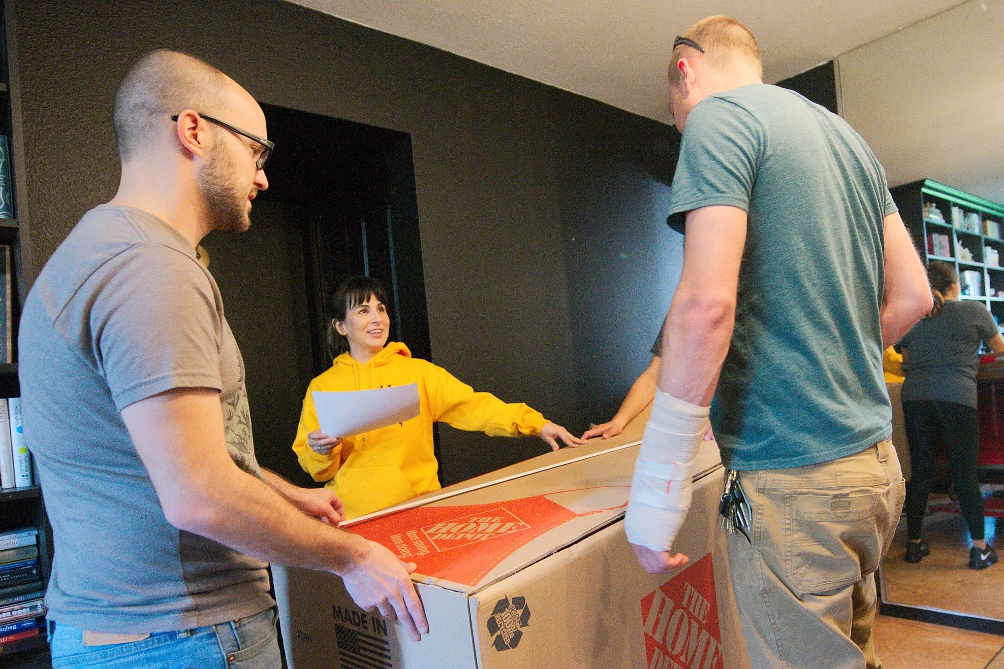Valerie Arroyo (center) works on her team’s Idiotarod cart with Nick Woike (left), and Tyson Koger (right).