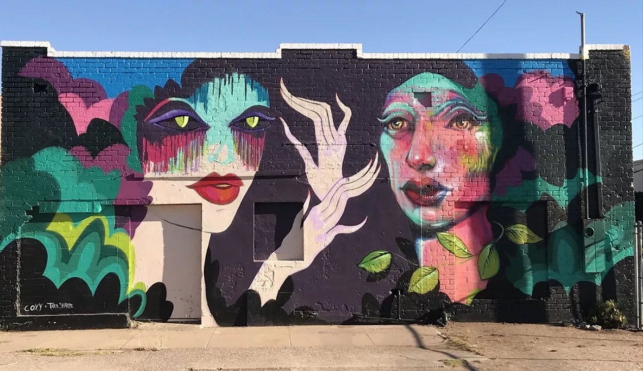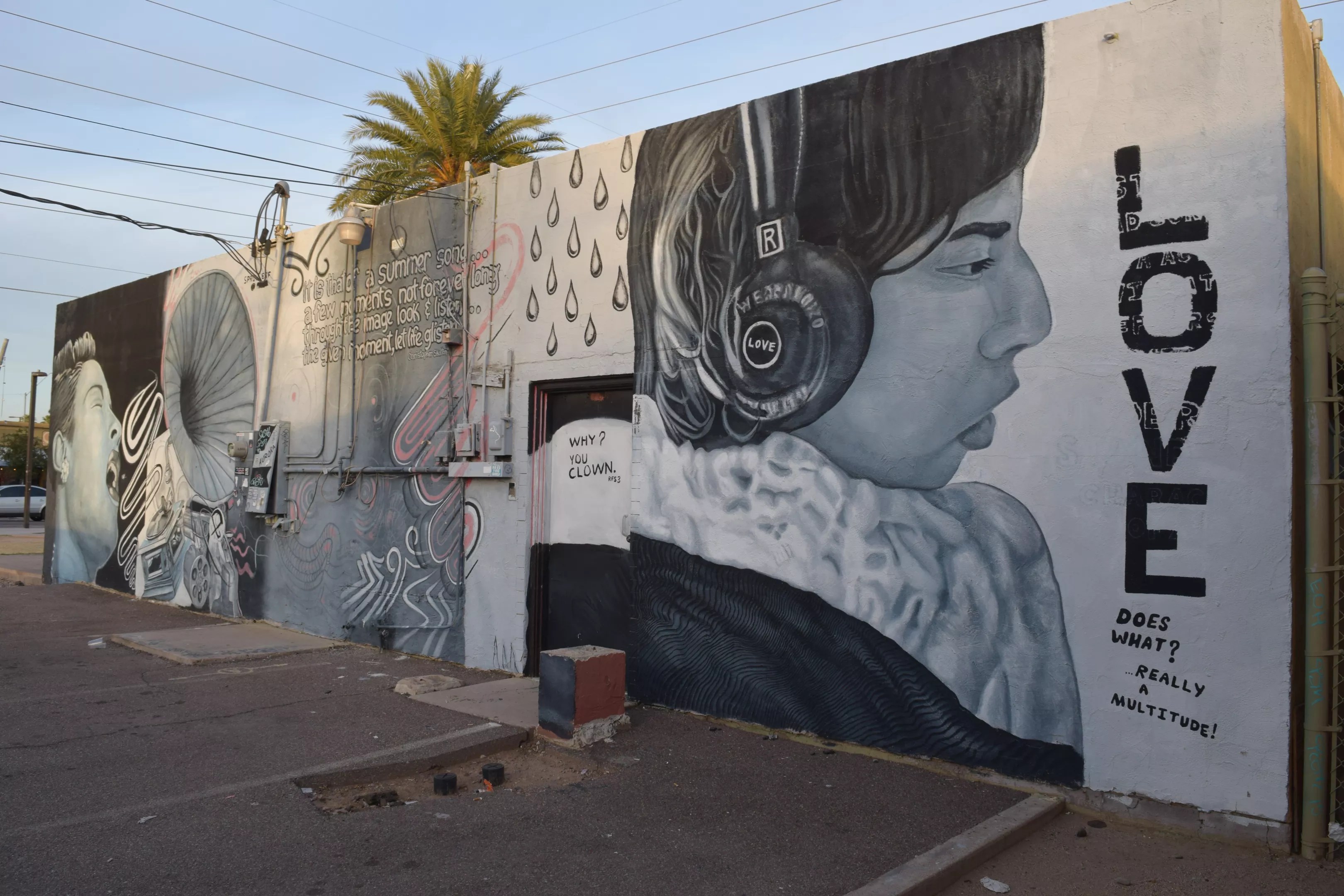 Love, peace, and music collide in Roy Sproul’s grayscale mural located on a west-facing wall at former Revolver Records building. The work depicts music-related technology, including giant headsets and a gramophone. Sproul’s other local work includes a large-scale scene with characters from various theatrical productions, which takes up the entire north-facing wall at the offices for Valley Youth Theatre.