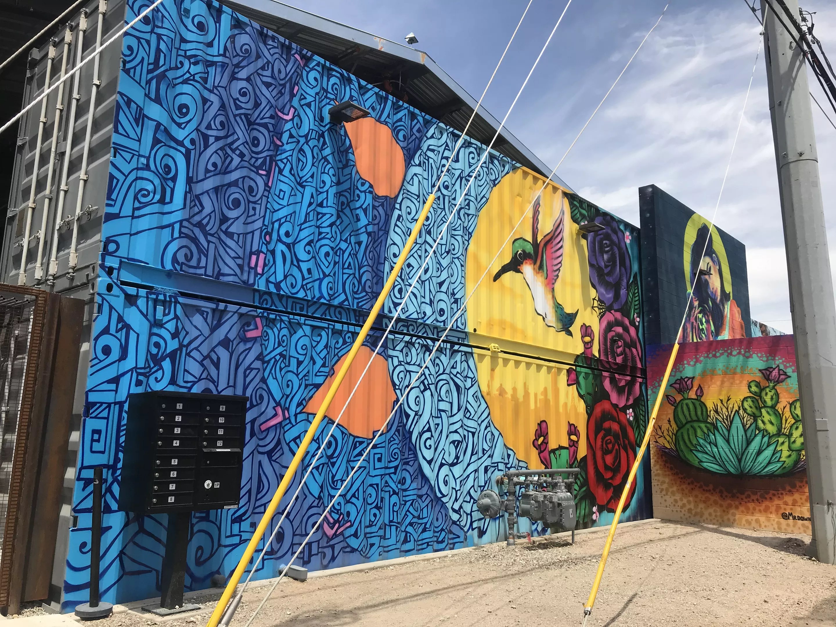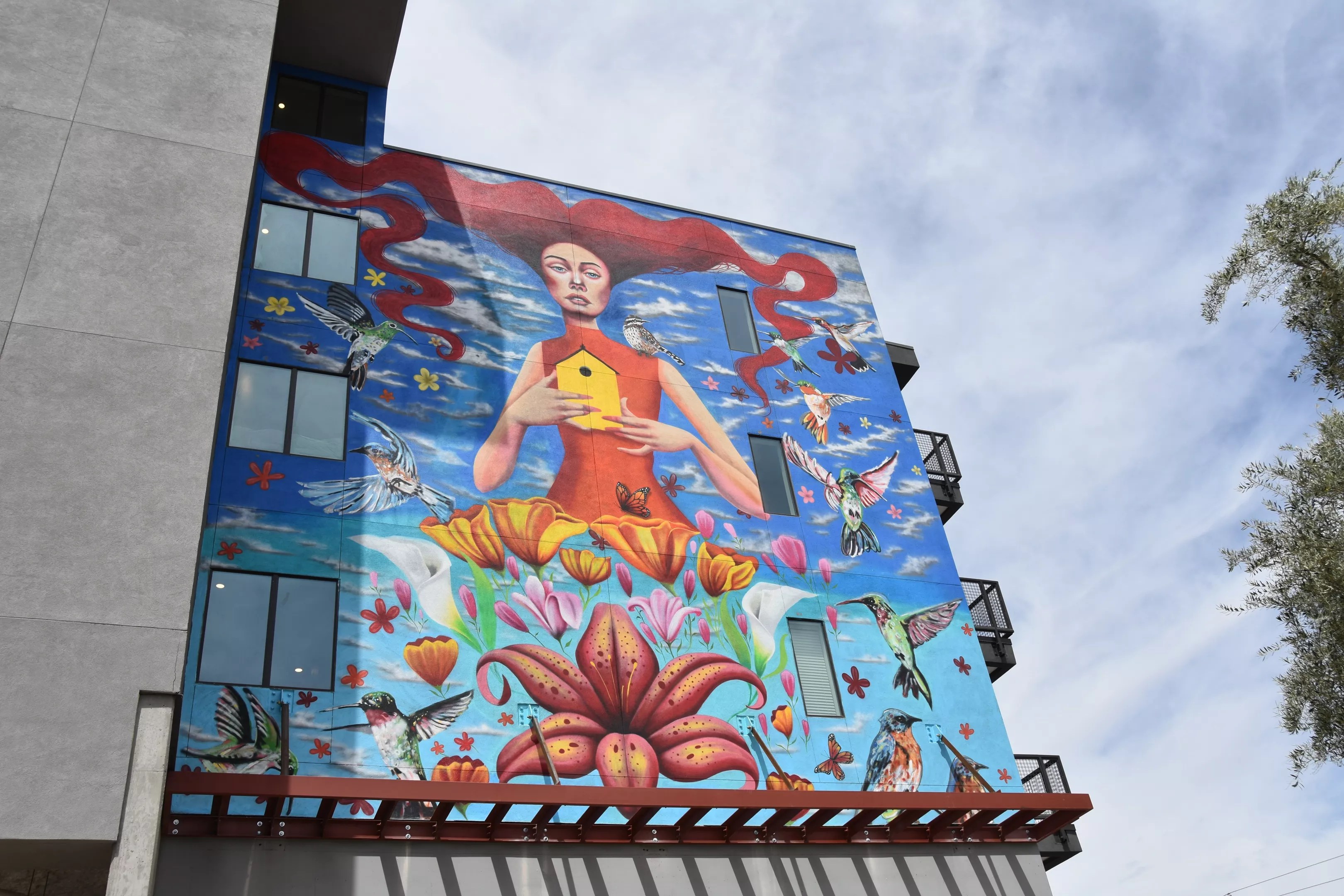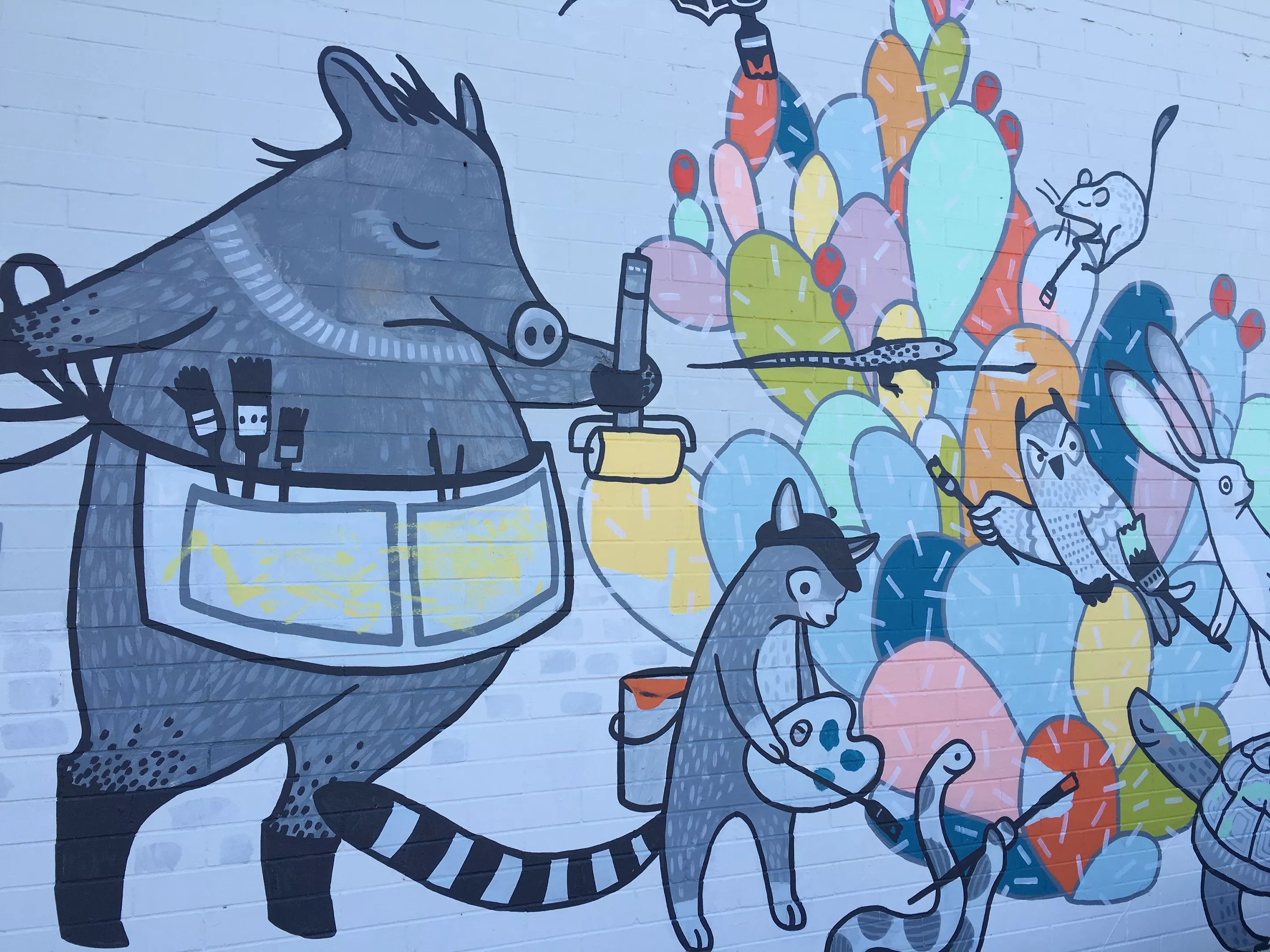 Look for Timothy Chapman’s mural paying homage to desert plants and the mythical rabbit-like creature on the north side of Camelback Road just west of Central Avenue, in a part of town where you’ll also find murals by Carrie Marill, Clyde, and other artists. Like several of the best murals in metro Phoenix, this piece makes a fun backdrop for selfies and other photographs. Amanda Adkins painted one of many murals at The Hive Art Gallery. Lynn Trimble