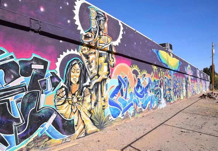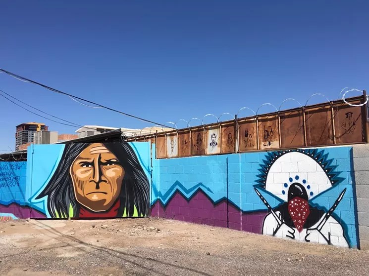 On a long wall that runs behind Bentley Projects, there’s a mural by Douglas Miles, an artist who hails from the San Carlos Apache reservation just east of Globe. Created with help from Douglas Miles Jr., Monica Wapaha, and Danielle Mercado, the mural is rooted in Native American and Apache culture. Prominent figures include Geronimo and Our Lady of Apache (inspired the the iconic Our Lady of Guadalupe prevalent in Latino culture). Miles has other murals around town, at locations including monOrchid. Thomas “Breeze” Marcus and Lalo Cota portion of a collaborative mural project. Lynn Trimble