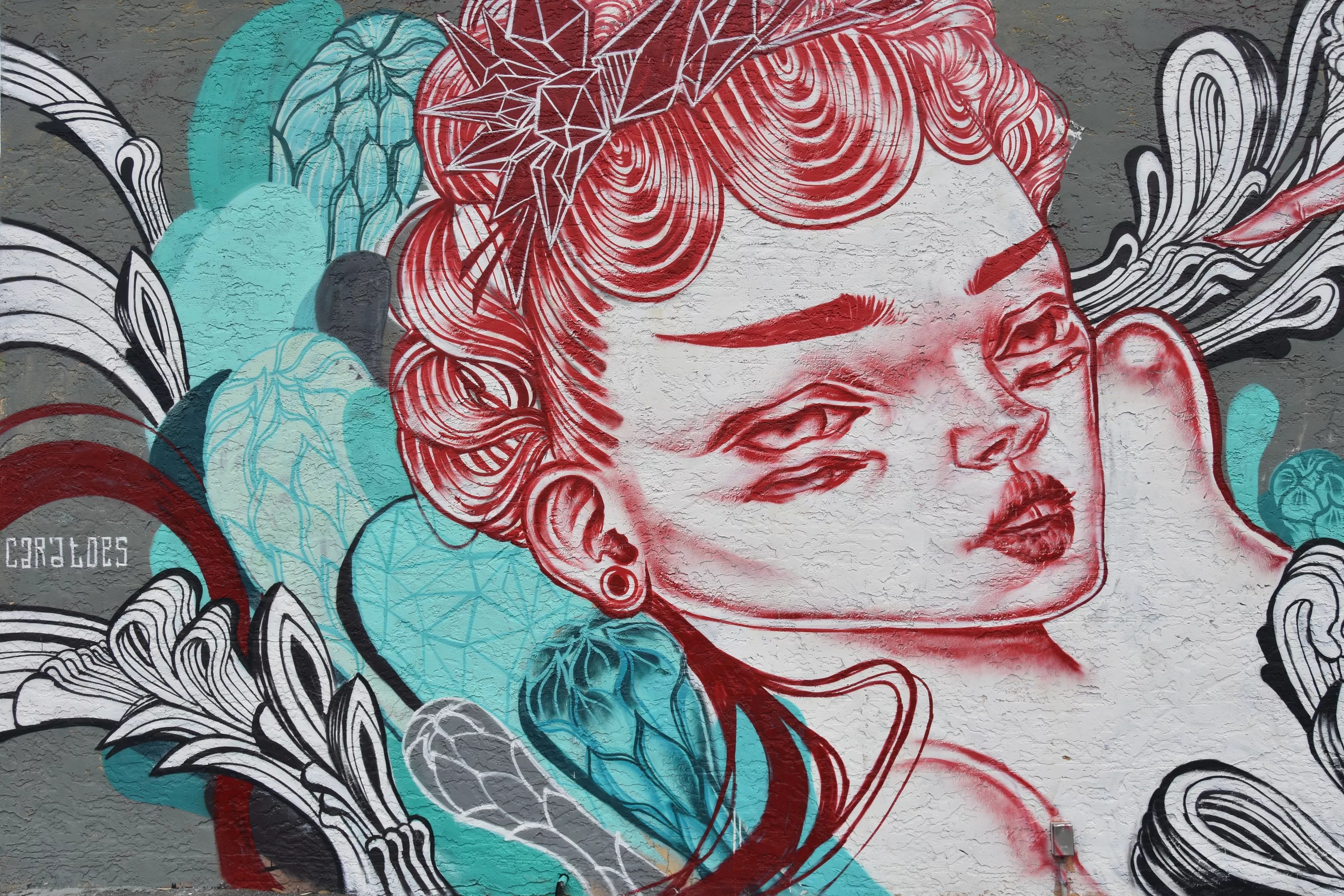 For this piece at Sutra Studios, a trio of artists with several works in downtown Phoenix collaborated to infuse a long wall with their signature styles. The hybridized design includes abstract and geometric designs, as well as images popular in the artists’ individual bodies of work. The mural stands as a vibrant marker of the creativity happening in and around Roosevelt Row. Look for one of Volar’s abstract murals at 16th Street and Missouri. Detail of Caratoes mural for Paint PHX 2015. Lynn Trimble