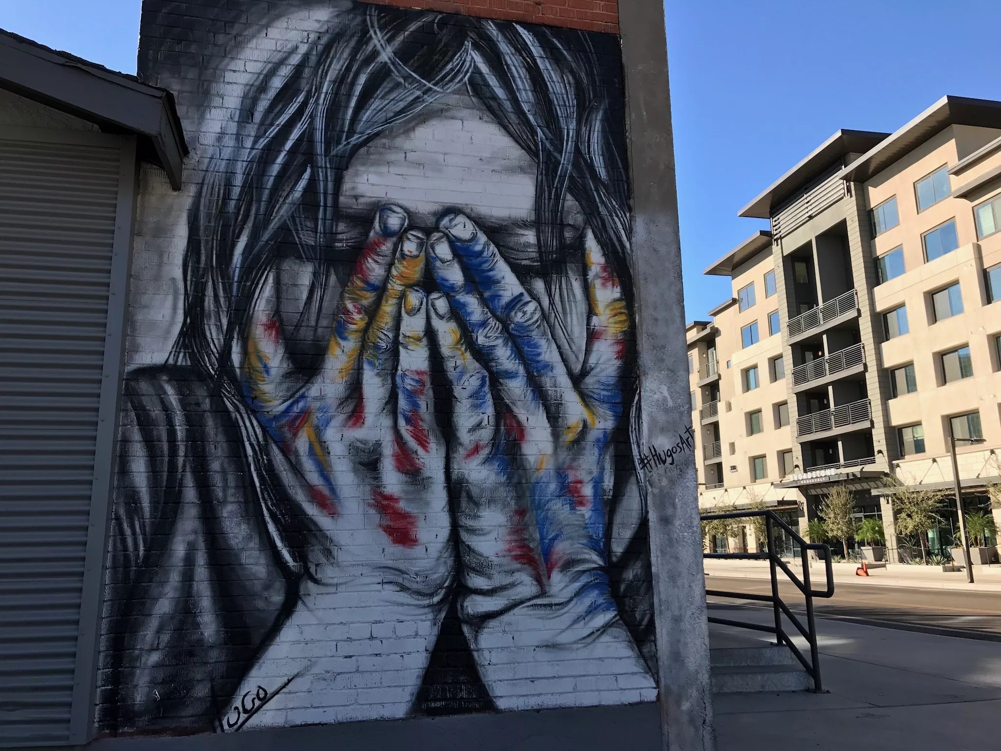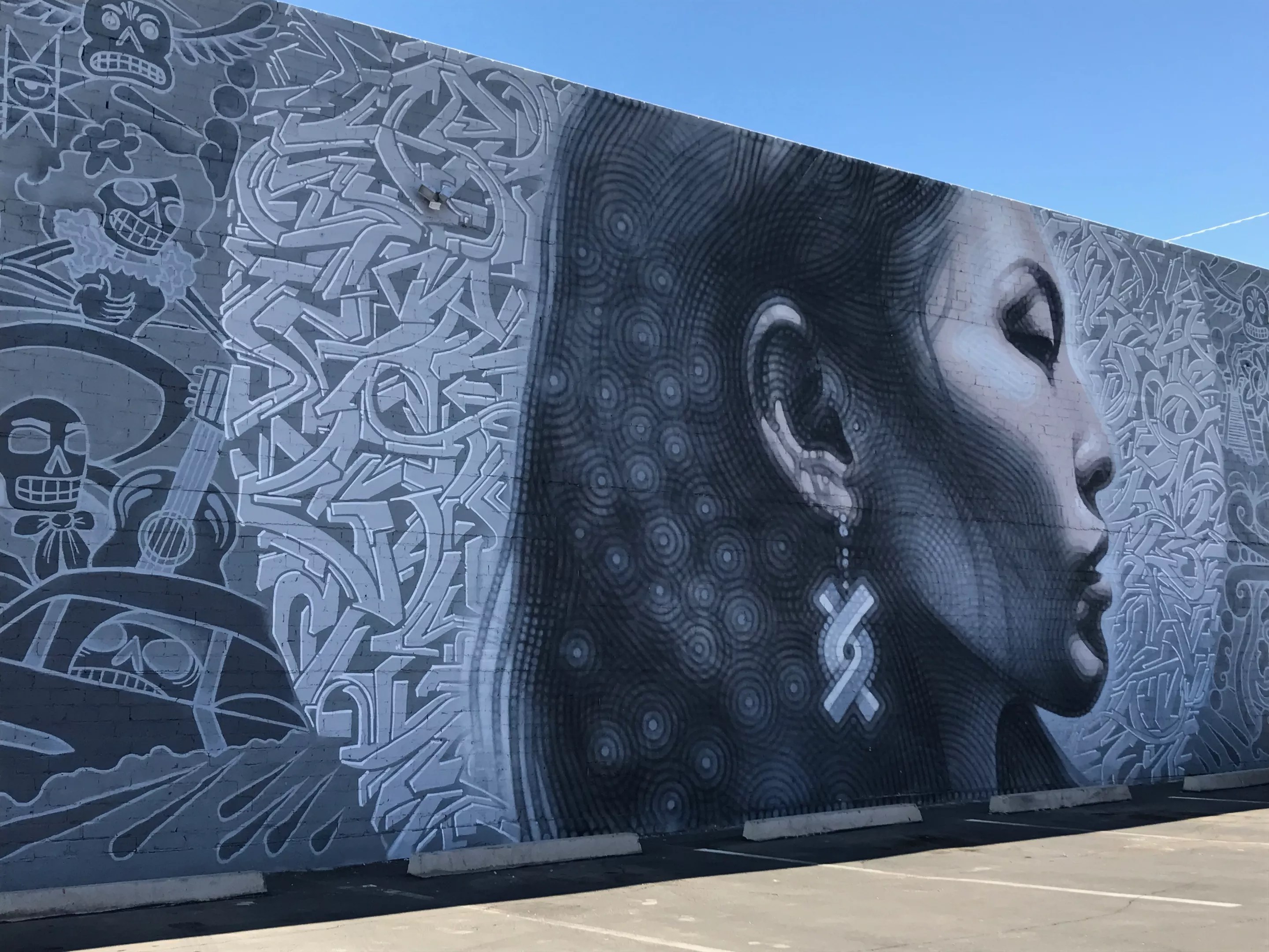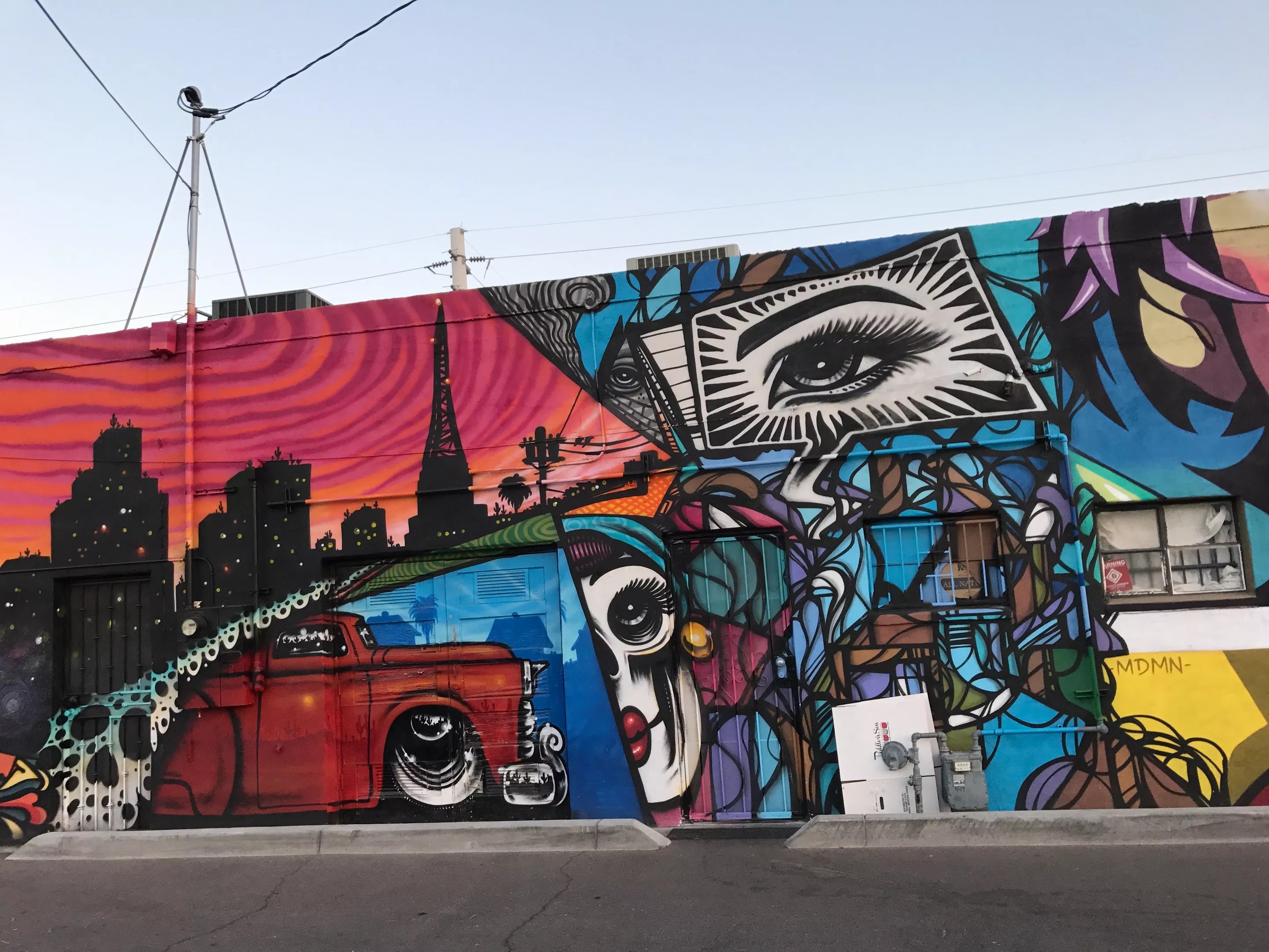 Artist Maggie Keane payed tribute to Prince by painting this mural in the Grand Avenue arts district in 2019. The mural features several portraits of the artist, including a central image with giant automotive mirrors that serve as sunglasses lens. Keane has painted murals of several additional musicians around town, including David Bowie. Nevercrew mural painted in 2018 on the historic Heard building in downtown Phoenix. Lynn Trimble