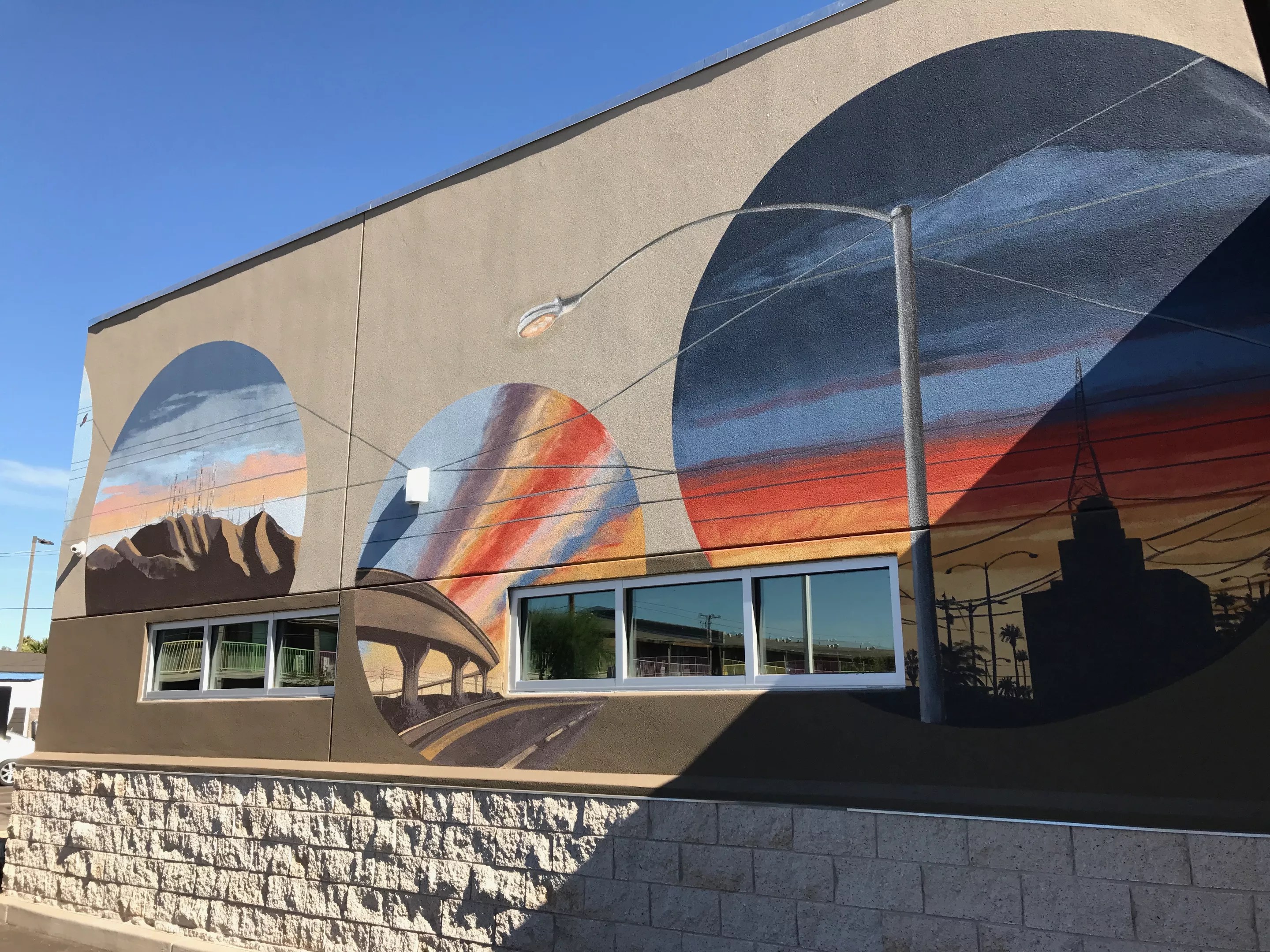 Best created this mural at the intersection of Grand Avenue and Roosevelt Street in 2017. The piece comprises eight circular or semicircular vignettes connected by images of utility lines. The vignettes capture iconic Phoenix imagery such as the Arizona State Fairgrounds, Westward Ho, and South Mountain. They range in size from eight to 12 feet in diameter. Mural painted by El Mac, Mando Rascon, and Pablo Luna in 2015. Lynn Trimble