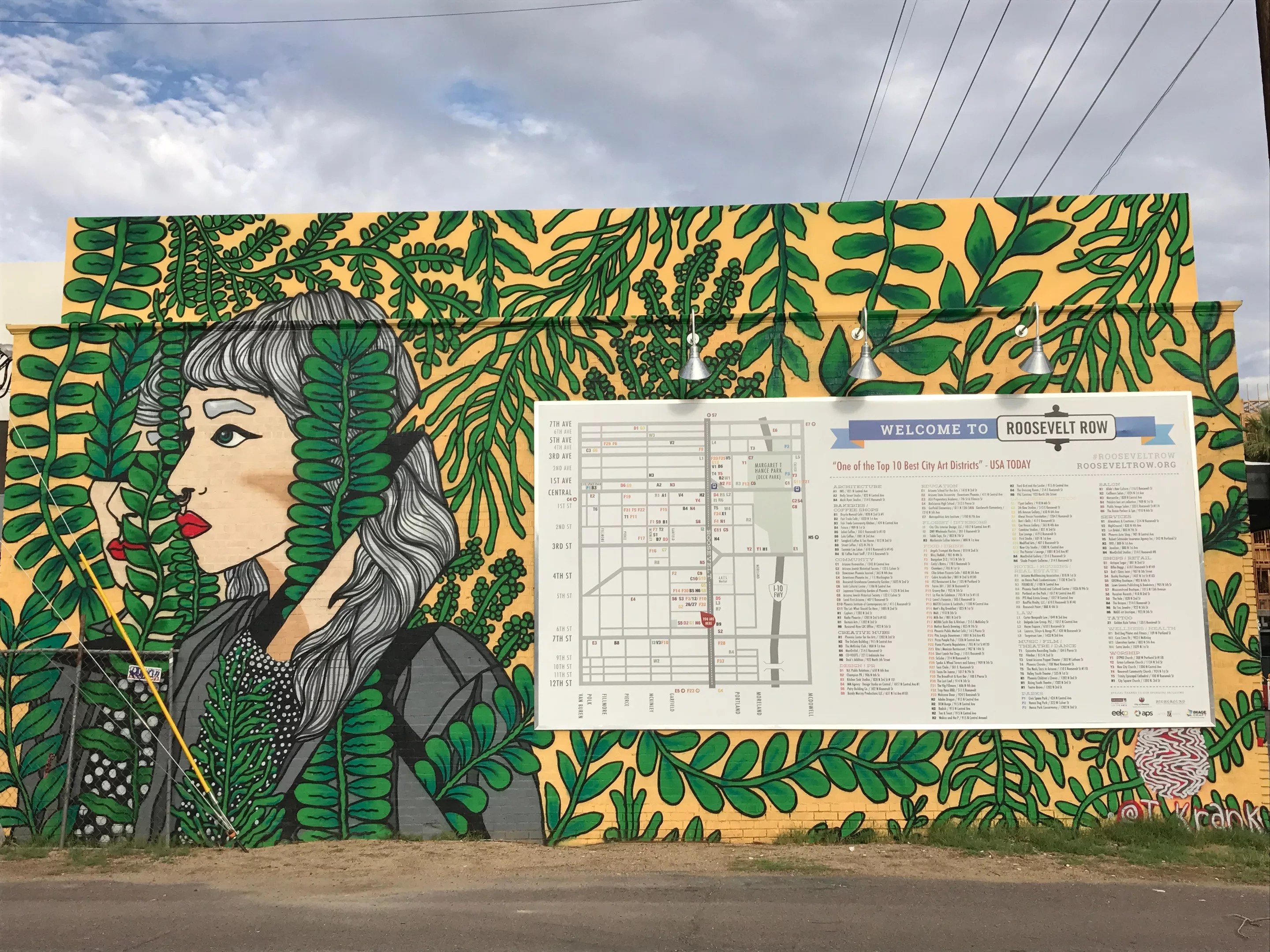 JB Snyder’s artwork, which has graced the official map for Roosevelt Row, has long been part of the ever-evolving arts district. It’s a beautiful mix of order with chaos, infused with bright colors like lime green and canary yellow that convey a sense of vibrancy and forward movement. One of several Snyder murals in downtown Phoenix, this piece painted in 2016 is a popular background for camera-happy tourists and locals. Snyder chose the mural’s unusual name because he’s painted three different designs on the same east-facing wall, starting in 2010.