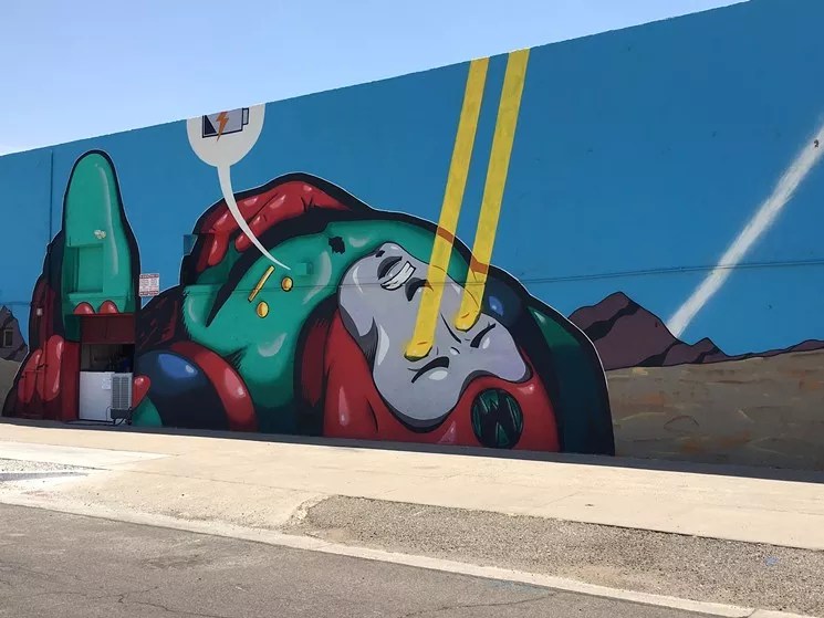 A Los Angeles-based artist with Arizona roots, MDMN was one of several artists who participated in Paint PHX 2016, when he created this 100-foot piece reflecting his sci-fi, futuristic-yet-retro vibe. It’s located on the north-facing wall at Fast Signs, on Central Avenue south of Thomas Road. Look for his work at several other spots around town, including a multi-artist collaboration at Carly’s Bistro. This collaborative mural is located at 16th Street and McDowell Road. Lynn Trimble