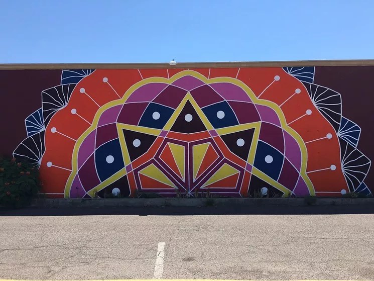 This collaborative mural painted in an alleyway east of The Churchill features work by some of the Valley’s best-known mural artists, including Lalo Cota and Thomas “Breeze” Marcus. Highlights include Lucinda Hinojos’ work raising awareness of murdered and missing indigenous women. Participating artists also include mural co-organizer Isaac Caruso, as well as Josh Brizuela, Andy Brown, Tato Caraveo, and JJ Horner, and Nyla Lee. Kyllan Maney’s metro Phoenix murals include this piece at The Dhaba in Tempe. Lynn Trimble