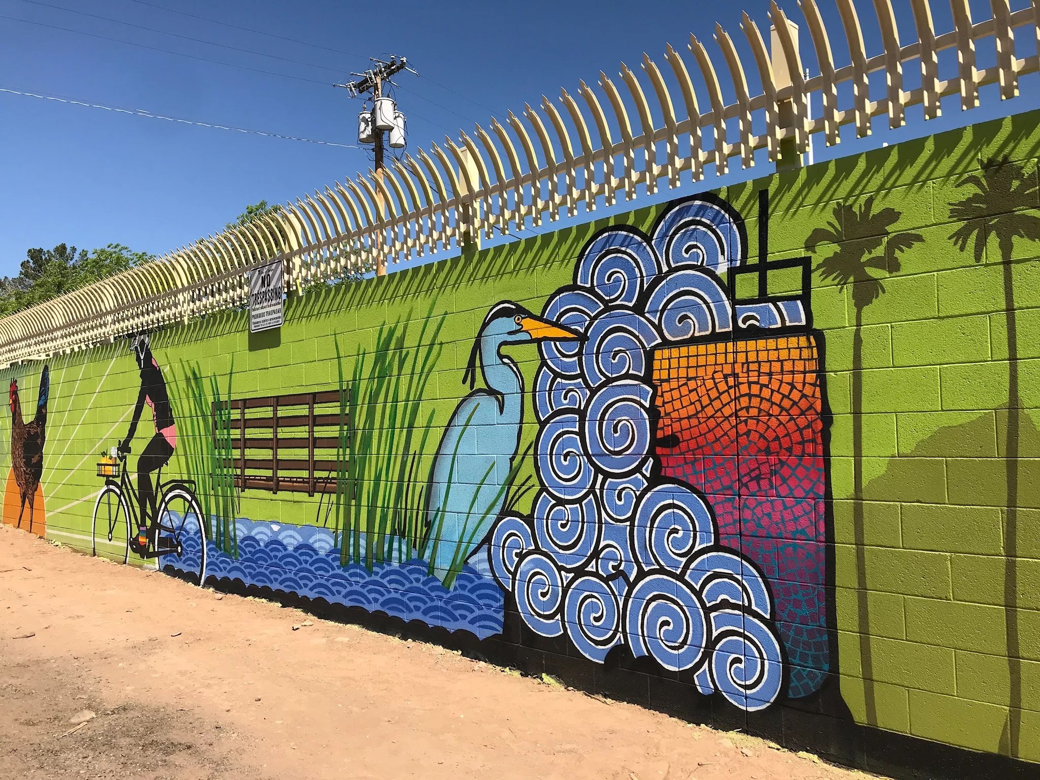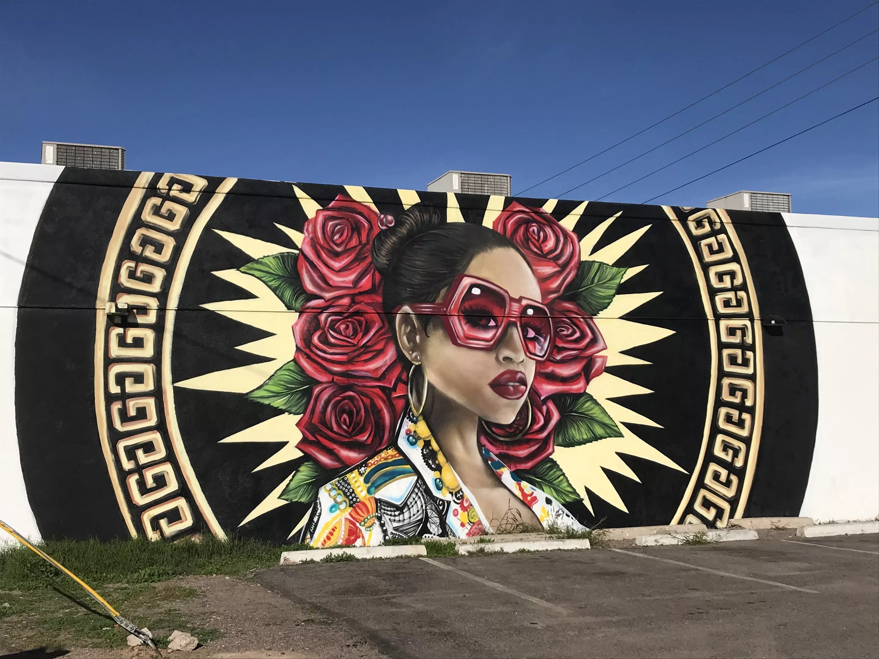 Several artists who work together under the name Graffaholeks Crew painted a giant portrait of a woman wearing rose-colored sunglasses, flanked by bold designs. It’s located on the south side of the Mia’s Flowers at the intersection of 16th Street and McDowell Road. Mural by Beatrice Moore located just off Grand Avenue. Lynn Trimble