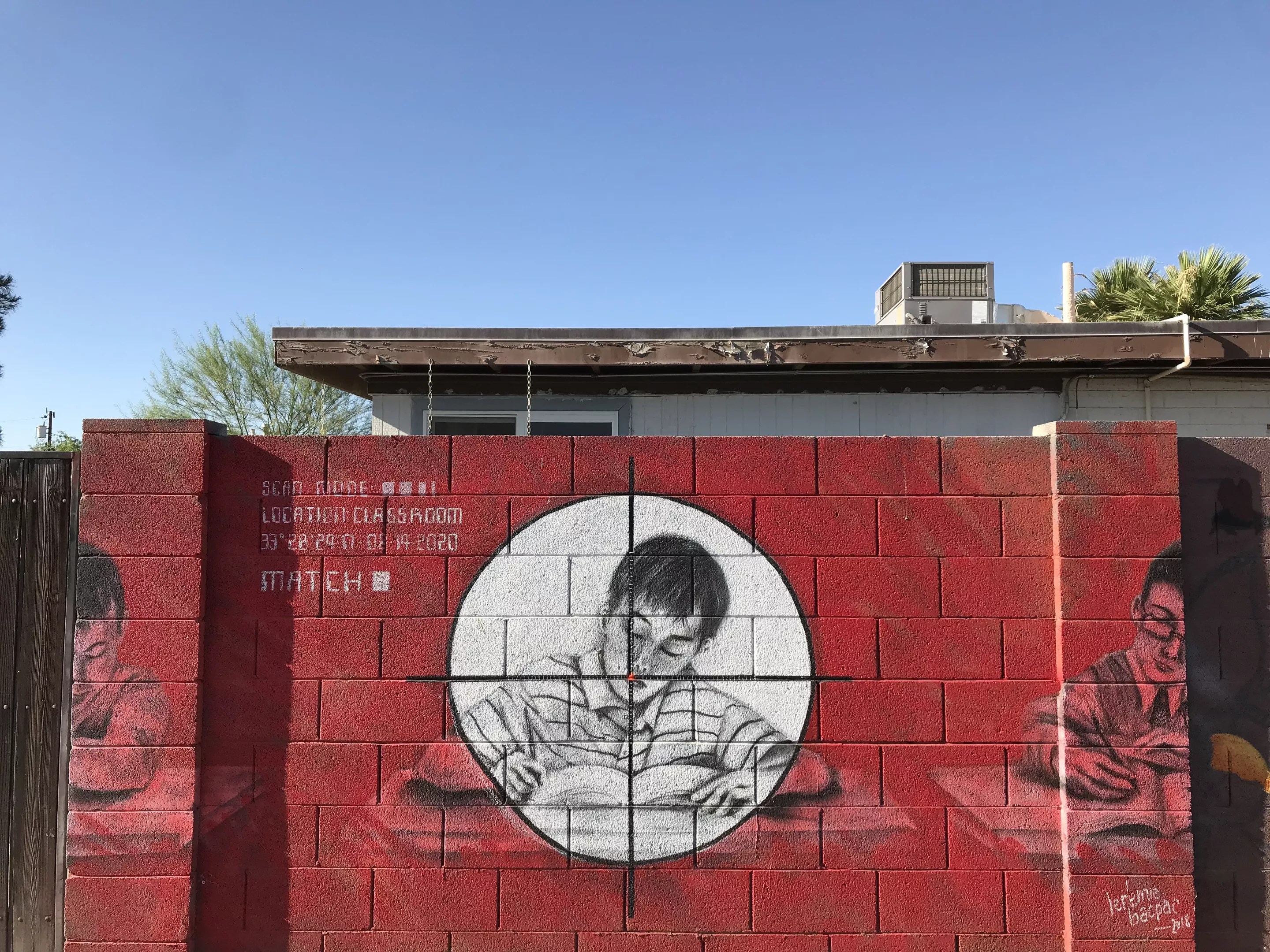 While the progressive advocacy group Netroots Nation was in town during July 2015, several artists worked with Tucson’s Colibri Center for Human Rights to create a migrant-theme mural. Chip Thomas (a.k.a. Jetsonorama) of the Navajo Nation, Jenn X. Chen of New York, Karlito Miller Espinosa (a.k.a. Mata Ruda) of New Jersey, and Thea Gahr of Mexico City and Oregon worked for several days on a mural depicting a central figure holding a photograph. It references those who’ve died while trying to cross the desert while migrating to the United States. Several local artists – including Lalo Cota, Jeff Slim, and Eduardo Pym – also worked on the mural. Laura Spalding Best’s Grand Avenue mural mirrors her larger body of work. Lynn Trimble