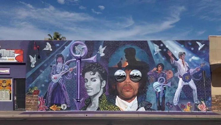 Shortly after Lauren Lee’s mural depicting three birds was lost to demolition in Roosevelt Row, the artist was busy working on the first public mural ever commissioned by the city of Tempe. Painted in May and June 2015, the mural’s 16 feet high and 153 feet wide. It depicts a long-haired woman lying on her side, surrounded by colorful birds and flowers. Lee has another impressive large-scale mural located at the SOHO apartments in Scottsdale. Maggie Keane’s massive Prince mural at 1350 West Roosevelt Street. Lynn Trimble
