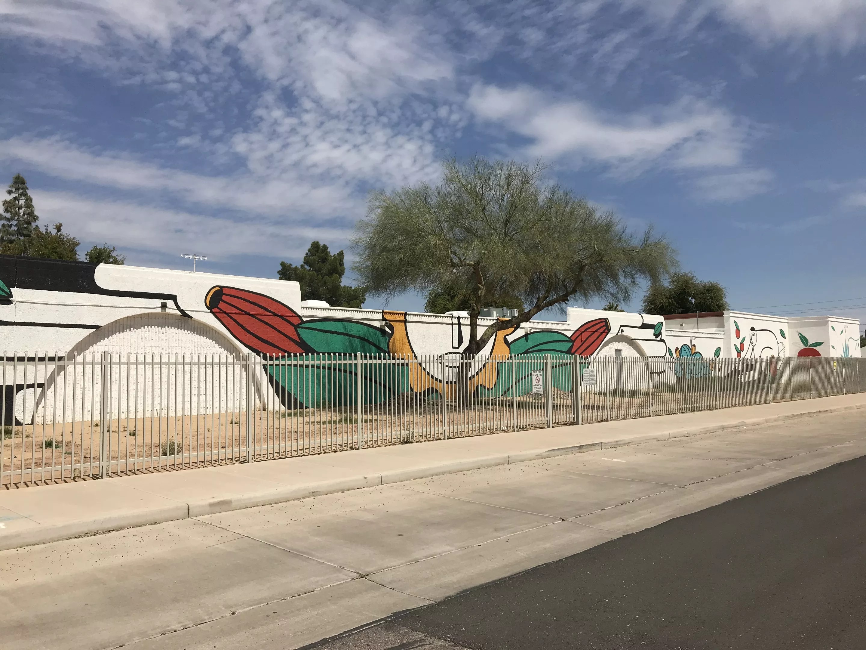 One of 10 murals created around the globe through the Estria Foundation and Black Mesa Water Coalition, this piece is designed to raise awareness about water-related issues in the Sonoran Desert. Located near Fillmore Street on Valley Youth Theatre’s building, the mural is a collaboration between Averian Chee, Angel Diaz, Xochitl Enriquez, Jeff Slim, Kim Smith, and Cyphers Center for Urban Art creatives. Timothy Chapman’s mural reflects his interest in animals and the desert landscape. Lynn Trimble