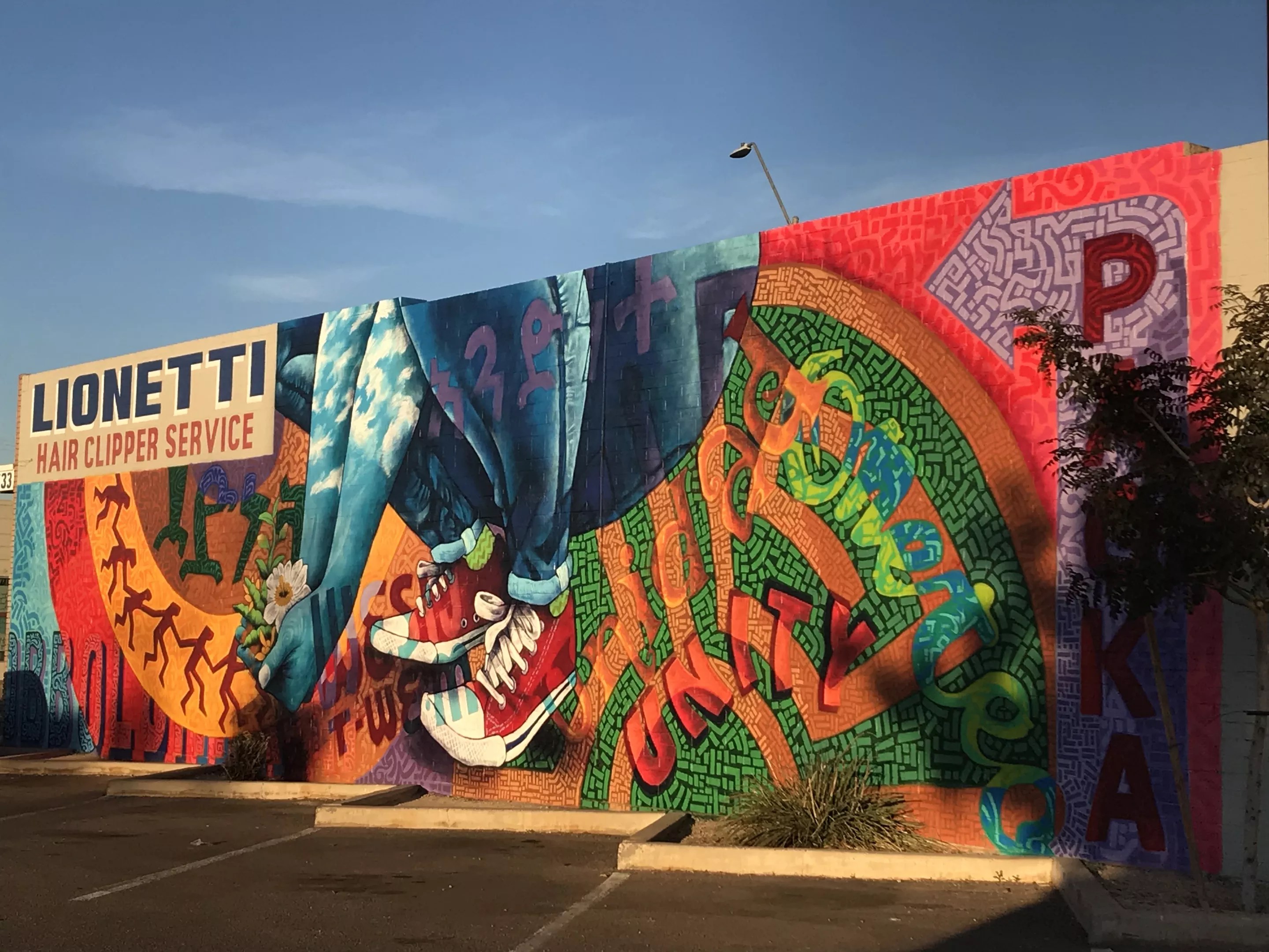 Mural by Ashley Macias, Yai Cecream, and Volar painted in Roosevelt Row in 2017.