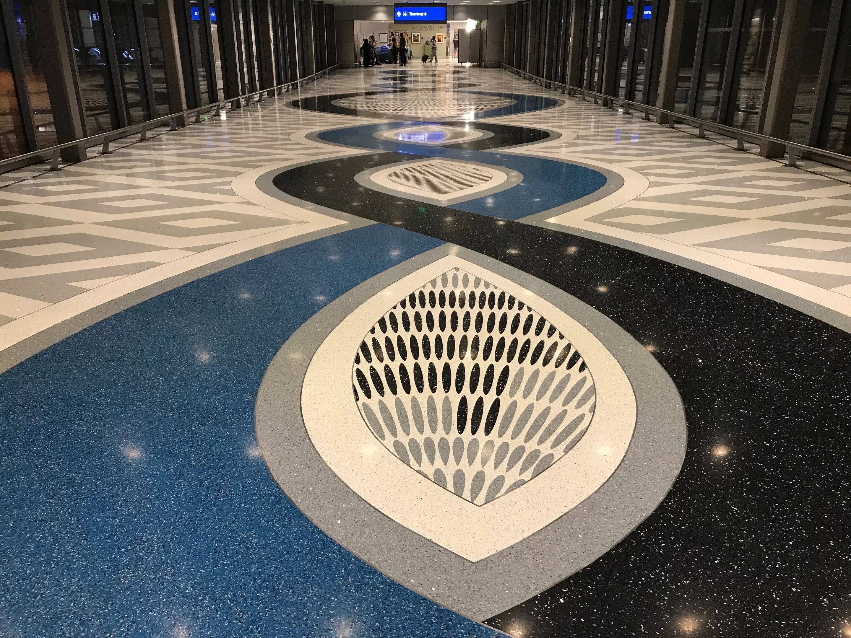 The Terminal 3 Station has two terrazzo floors by Janelle L. Stanley – one located on the station platform, and another on the bridge connecting the station to the terminal. Haak’u/Acoma Connection was inspired by traditional Haak’u/Acoma pottery and a “treasured family turquoise brooch.” Diné/Navajo Connection references traditional basketry and weaving forms.