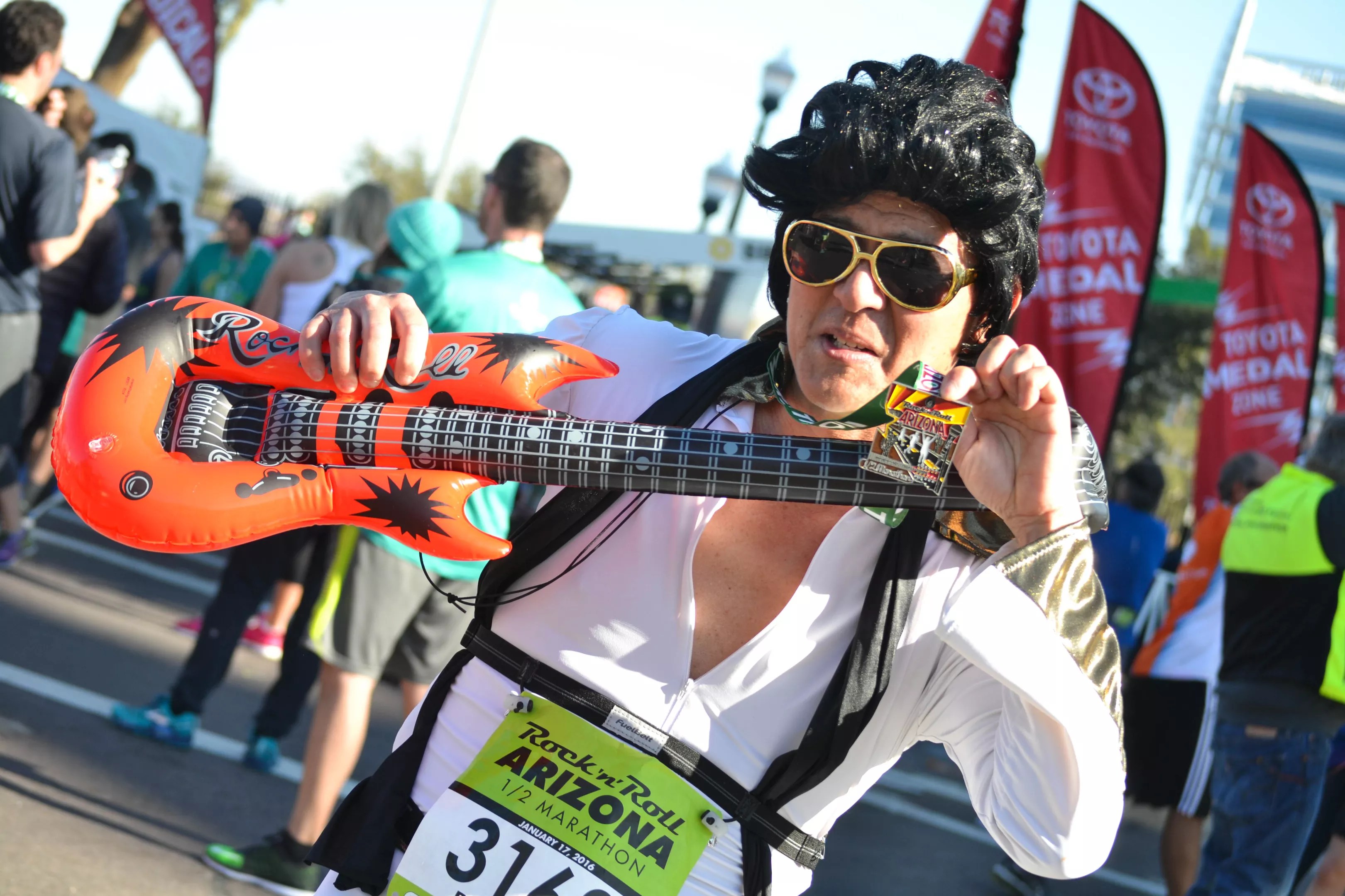 Elvis plays his guitar at the finish line.
