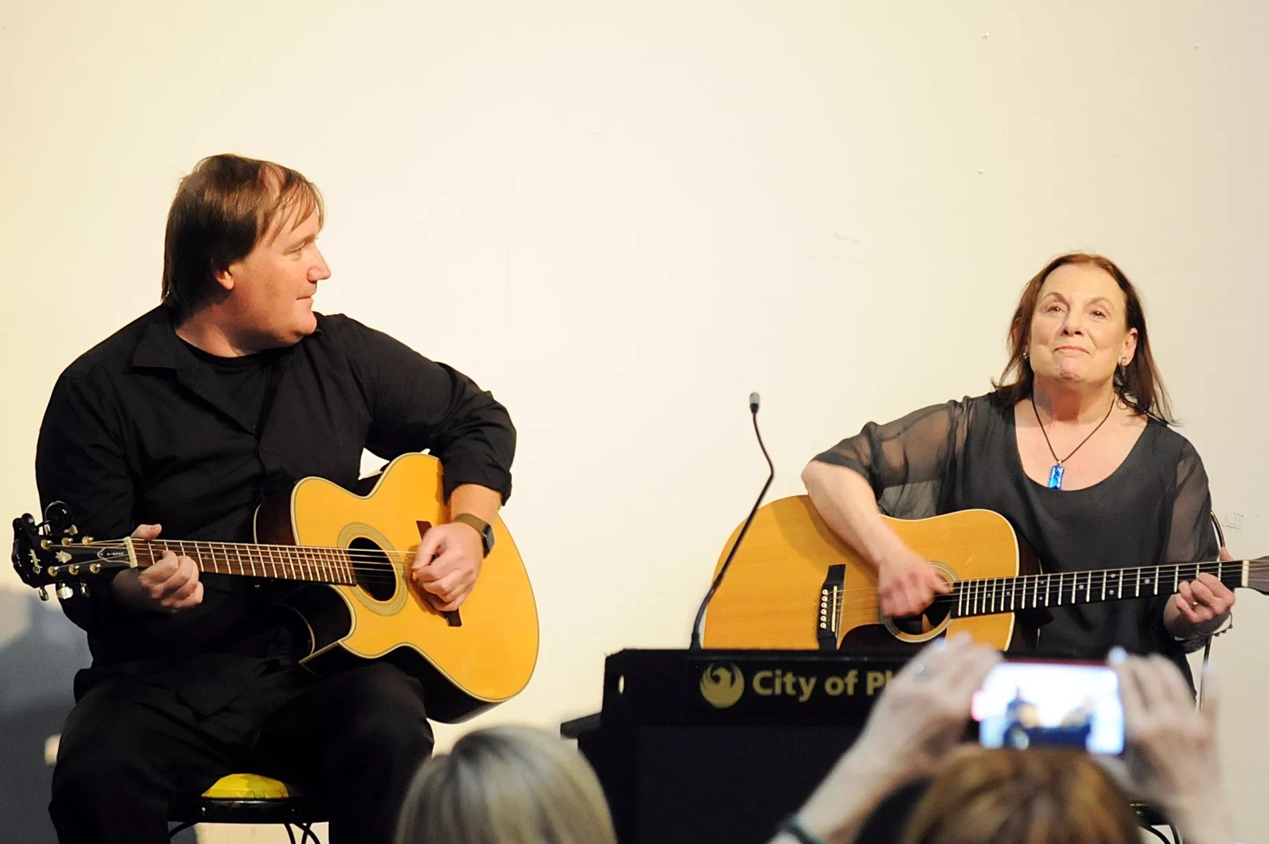 Carrie Thompson, left, Wallace’s daughter, and Billy Lowry, his grandson, perform “1954,” a song written by the late Mike Condello about Wallace and Ladmo.