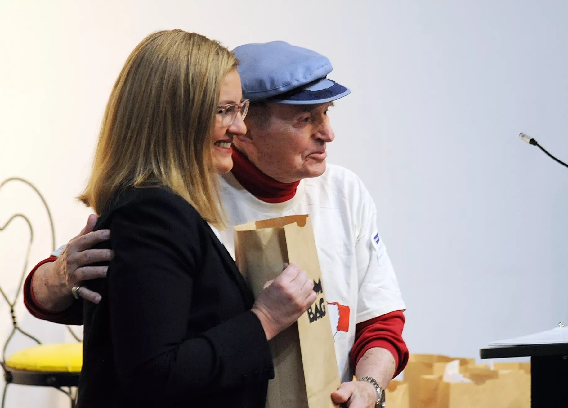 Phoenix Mayor Kate Gallego, left, is given a Ladmo Bag by local television personality and “Wallace and Ladmo” cast member Pat McMahon.