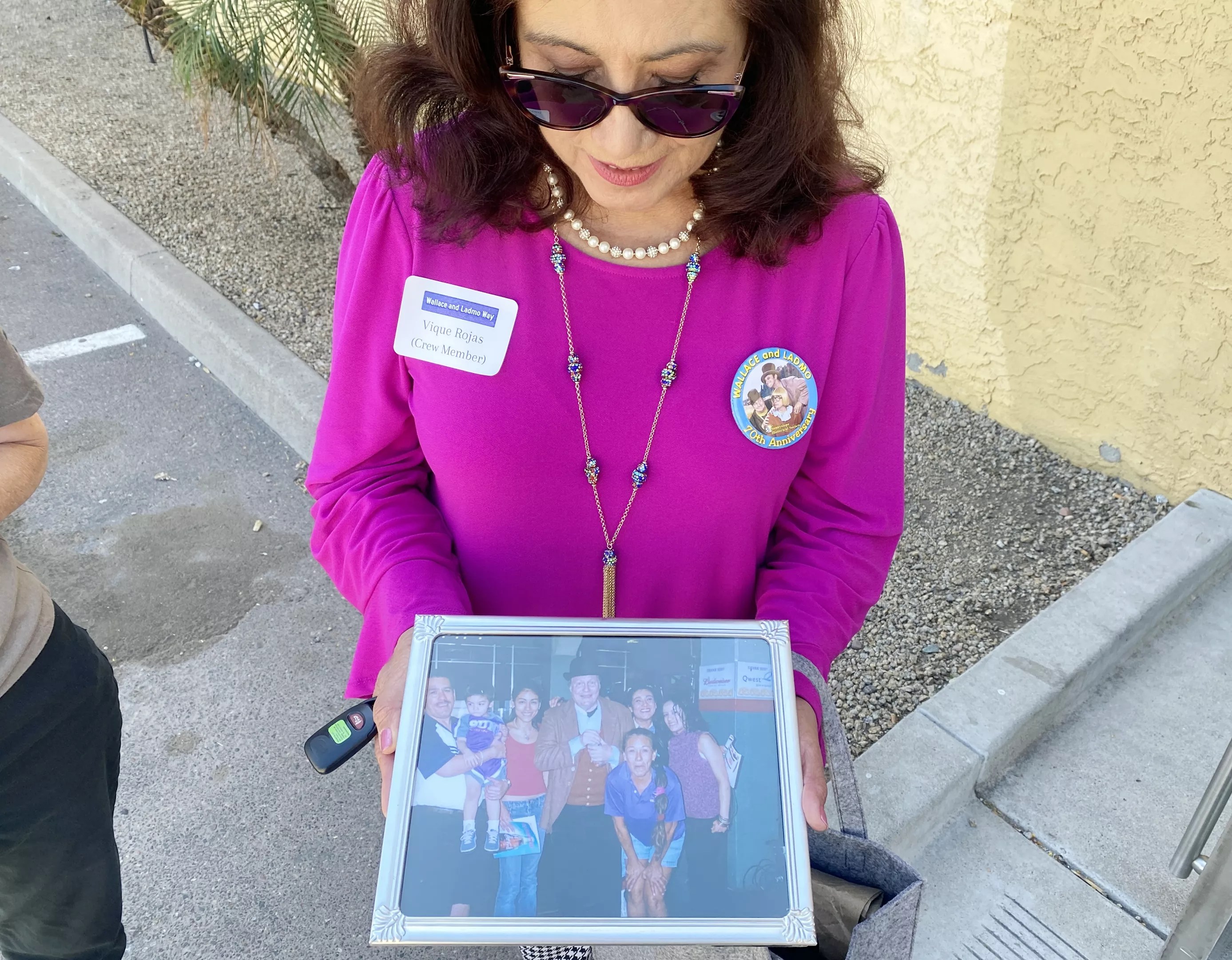 Vique Roja, a crew member on the “Wallace and Ladmo Show,” shows off a photo of her family with the late Bill “Wallace” Thompson.