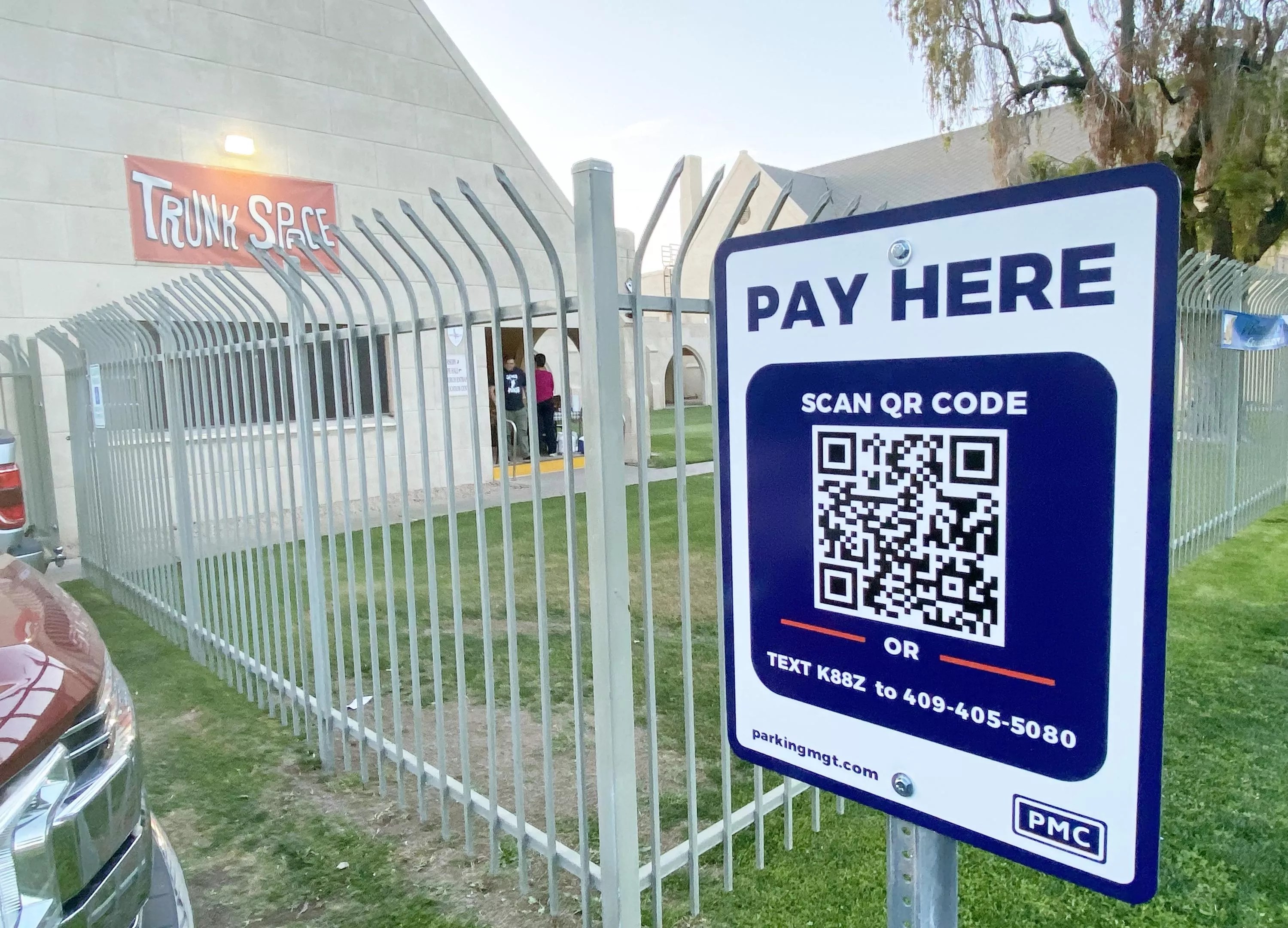 A sign for the paid parking system at Grace Lutheran Church in downtown Phoenix. The Trunk Space is located in the background.