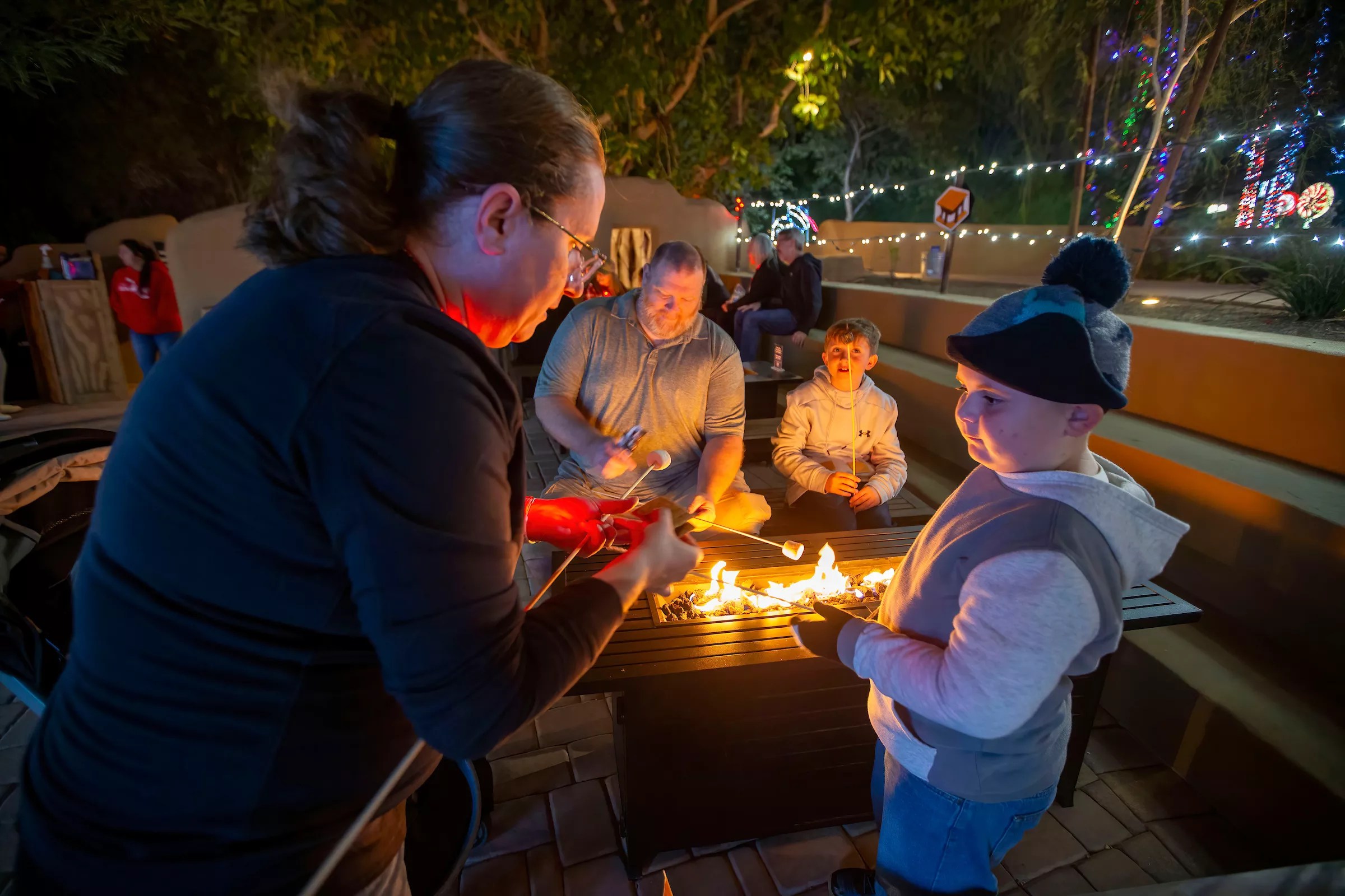 Not many. Most animals will be asleep and/or in indoor enclosures during ZooLights hours. If you want to see animals, your best bet is to get there at 5:30 p.m. when ZooLights opens. However, in years past, we’ve seen flamingos, otters, javelinas, bald eagles and porcupines during ZooLights. Your mileage may vary. People of all ages will enjoy the s’mores pit at ZooLights. Courtesy of Phoenix Zoo