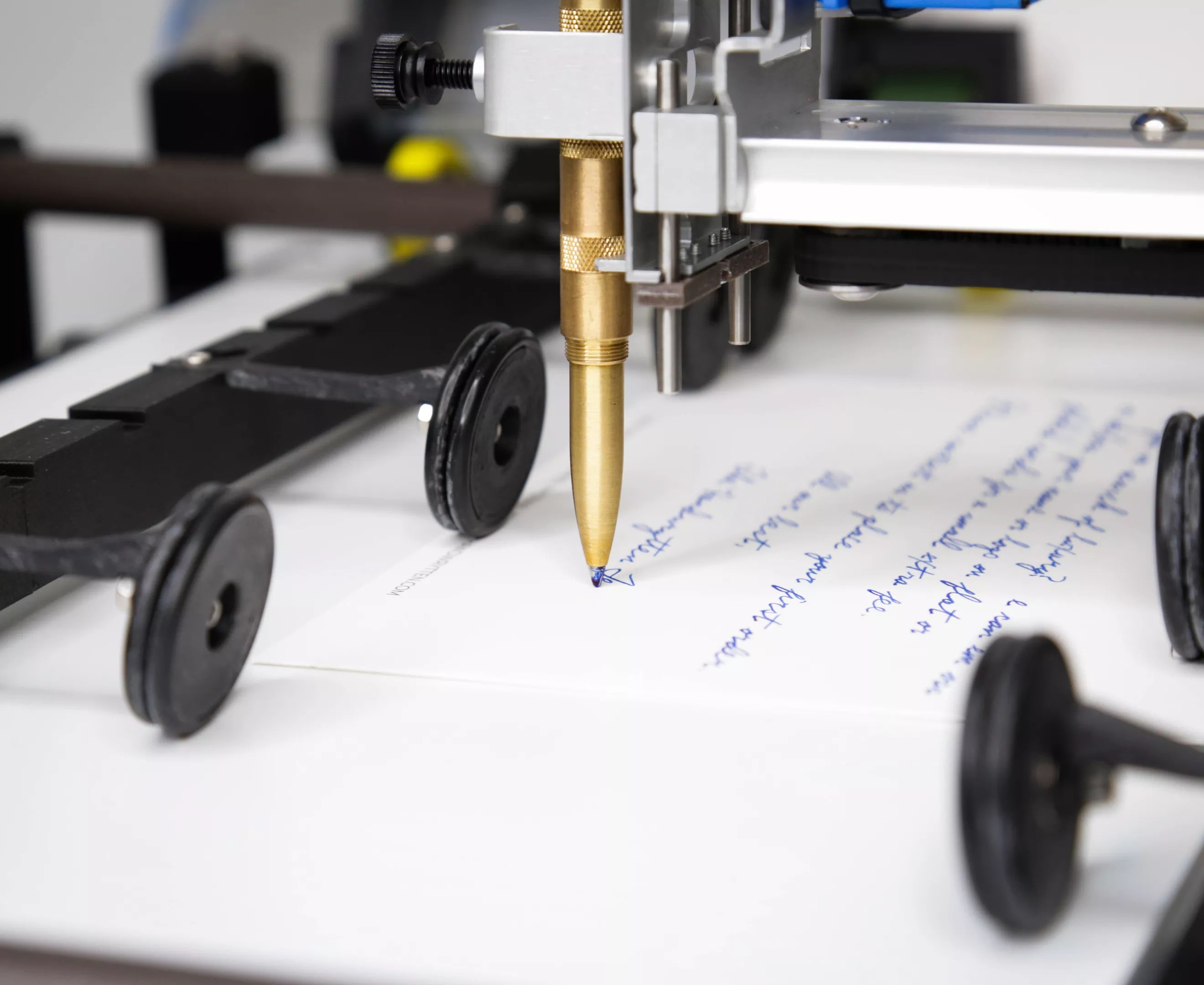 The robot, which closely resembled a small desktop laser-printer, clutched a gold metallic pen in one tiny arm, bobbing and jabbing at a thank-you note to someone named Triana.