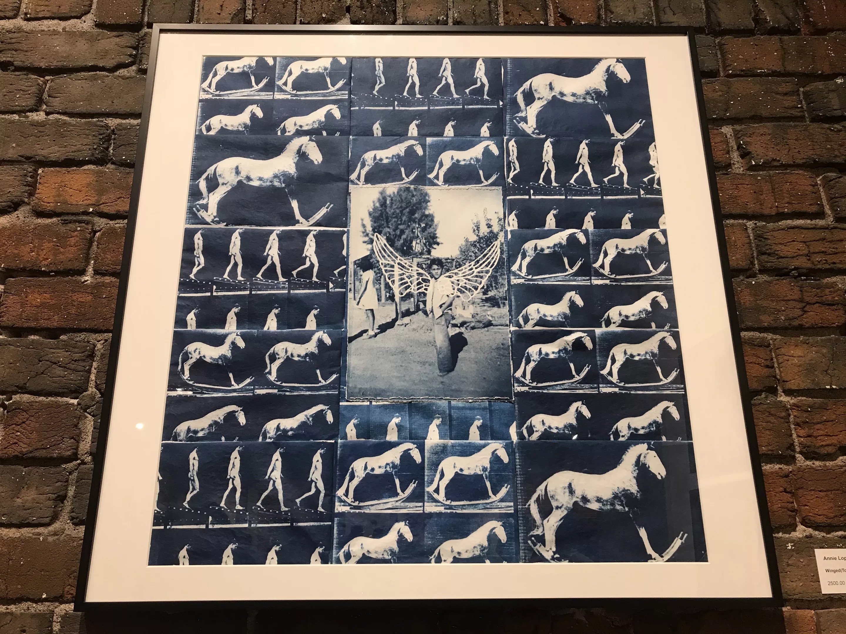 Annie Lopez, whose cyanotype photography often reflects her family’s immigrant roots, created a piece called Winged (Tony). The central image shows a boy with wings behind his back, and a girl turned away from the camera nearby. It’s surrounded by other images, of a rocking horse and a person walking, as if they were part of a motion study by 19th-century English photographer Eadweard Muybridge.