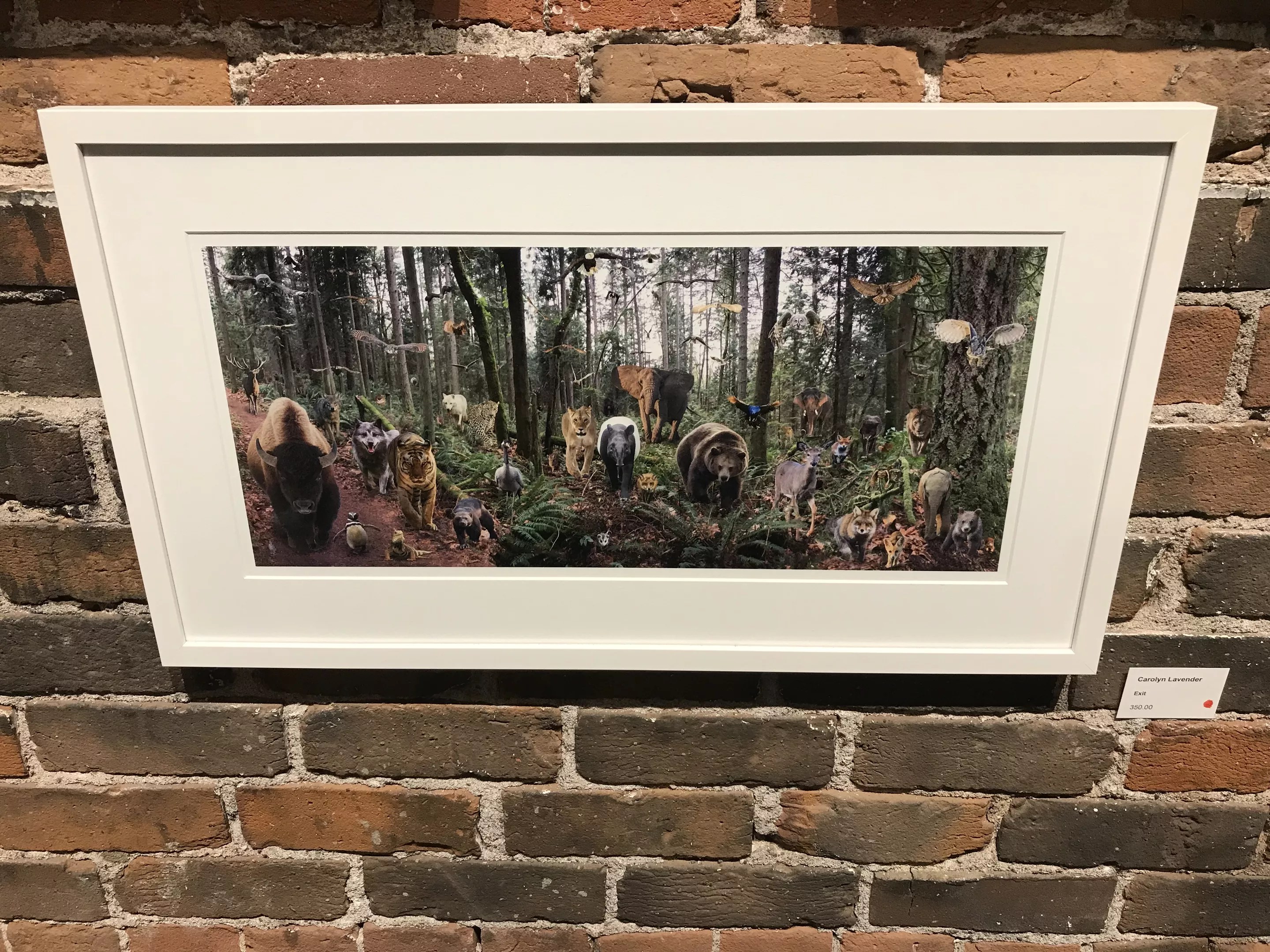 Another artist, Carolyn Lavender, digitally manipulated images of animals to create a mass exit from the forest. Exit includes not only wildlife you’d expect to find in a forest, but others as well, including a bison and penguin. Here, Lavender draws attention to the ways human interventions are making natural habitats increasingly less habitable for other animal species.