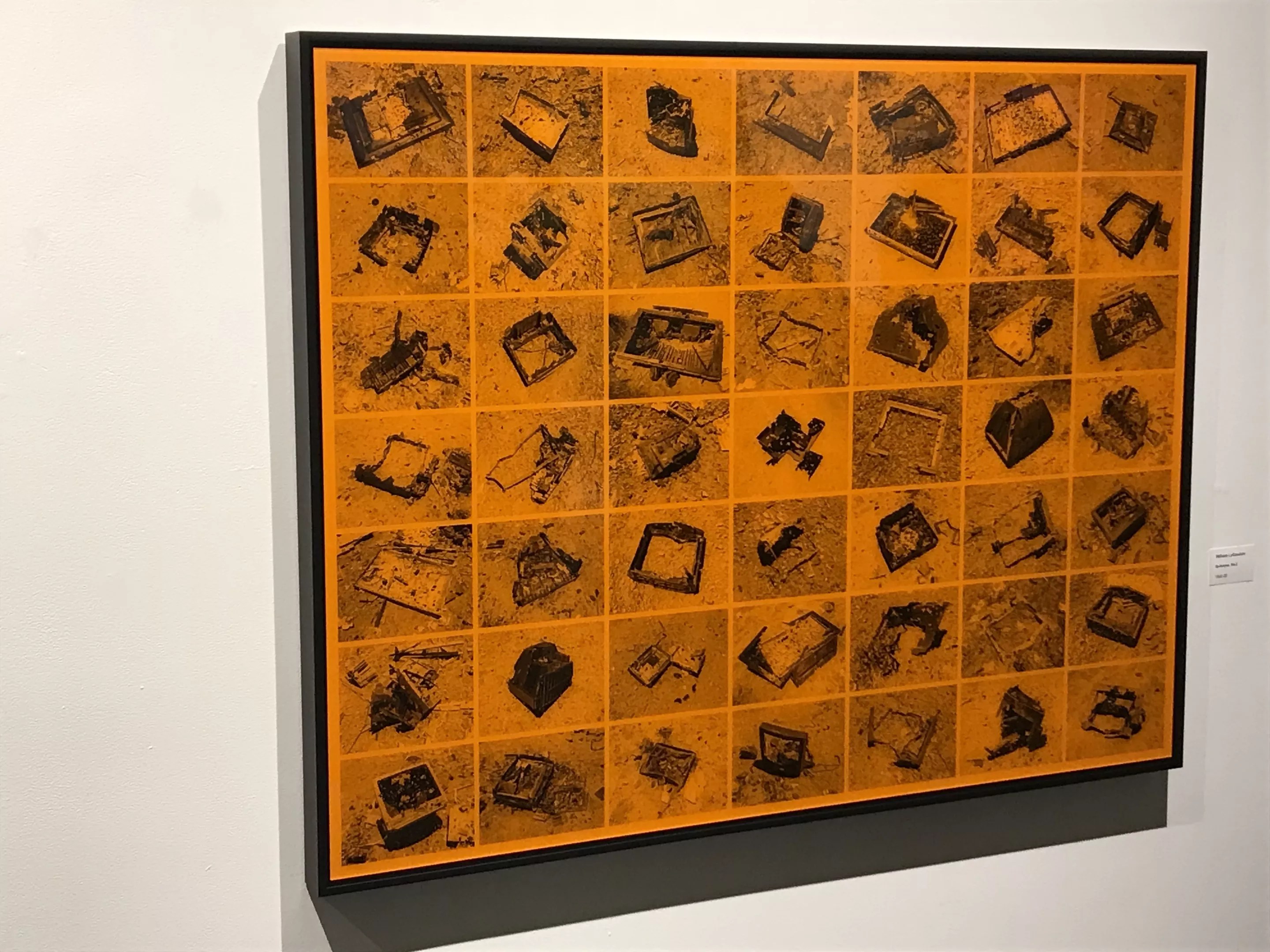 William LeGoullon, whose work often addresses the Arizona desert, showed a work from his “(Un)Intended Targets” series. Bullseyes No. 2 features a neat grid of images, each showing an object shot by someone doing target practice in the desert, with the bright orange color that’s prevalent in hunting attire. It’s a riveting meditation on human relationships to objects and the land.