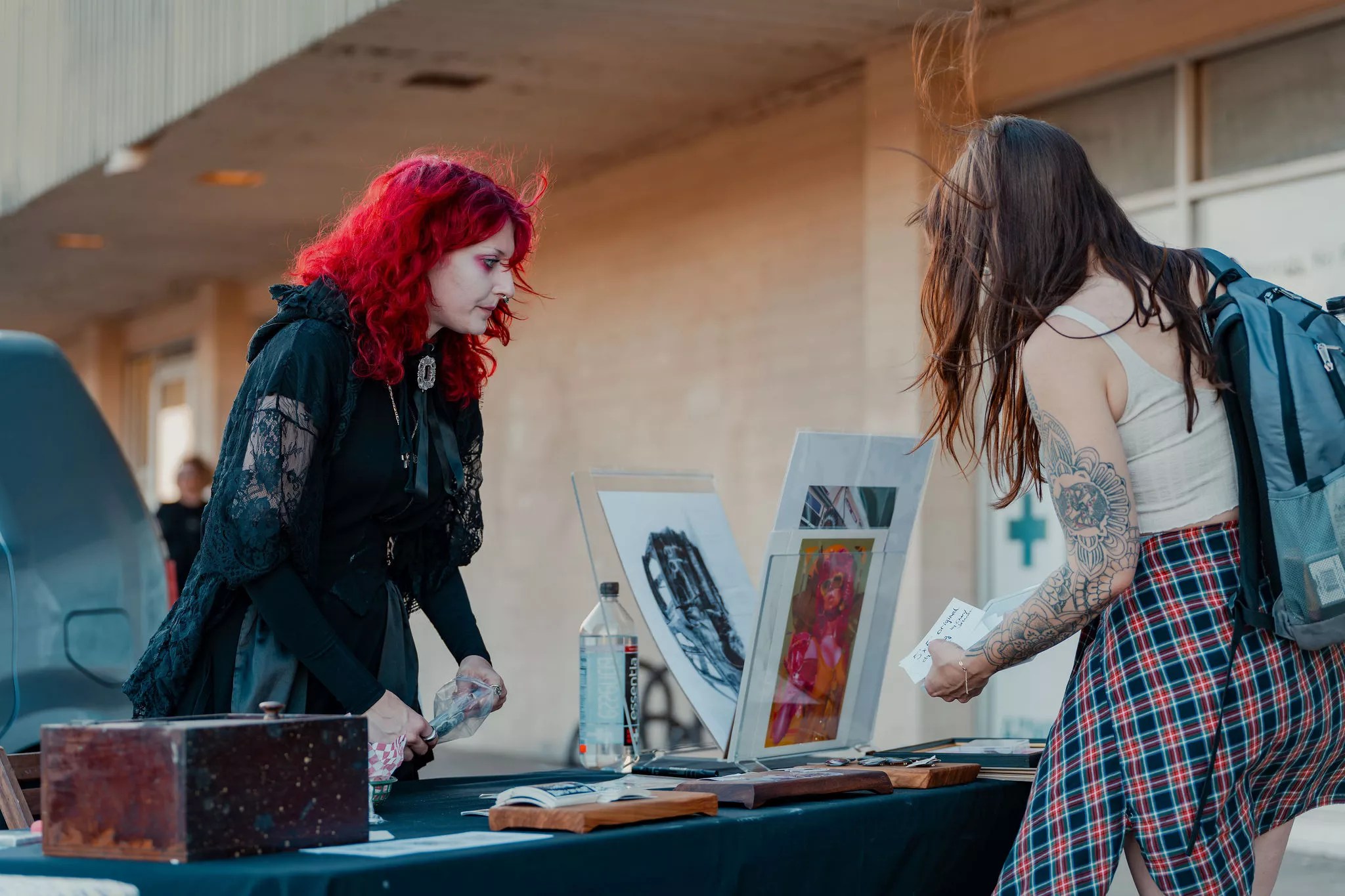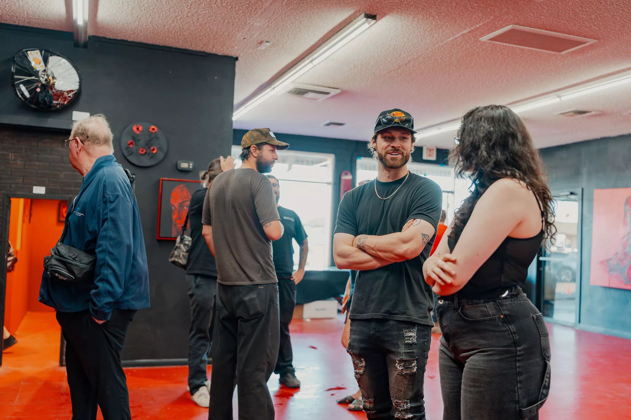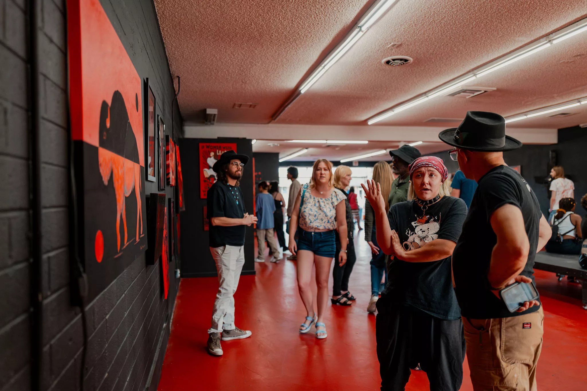 Artist and “Black and Red” co-curator Seth Manic Tongue speaks with an attendee.