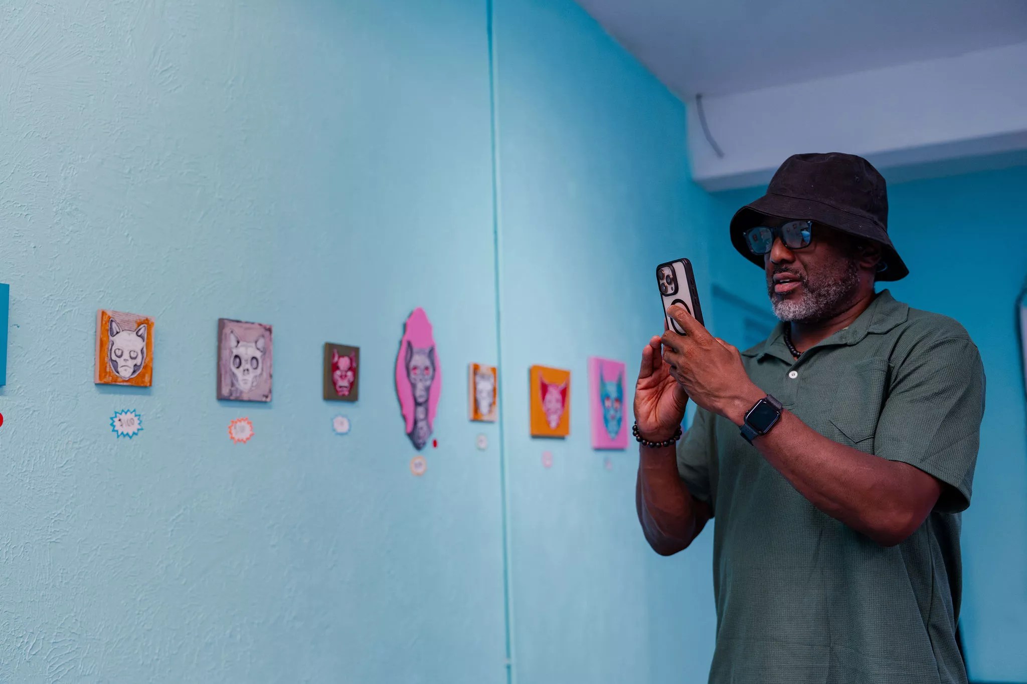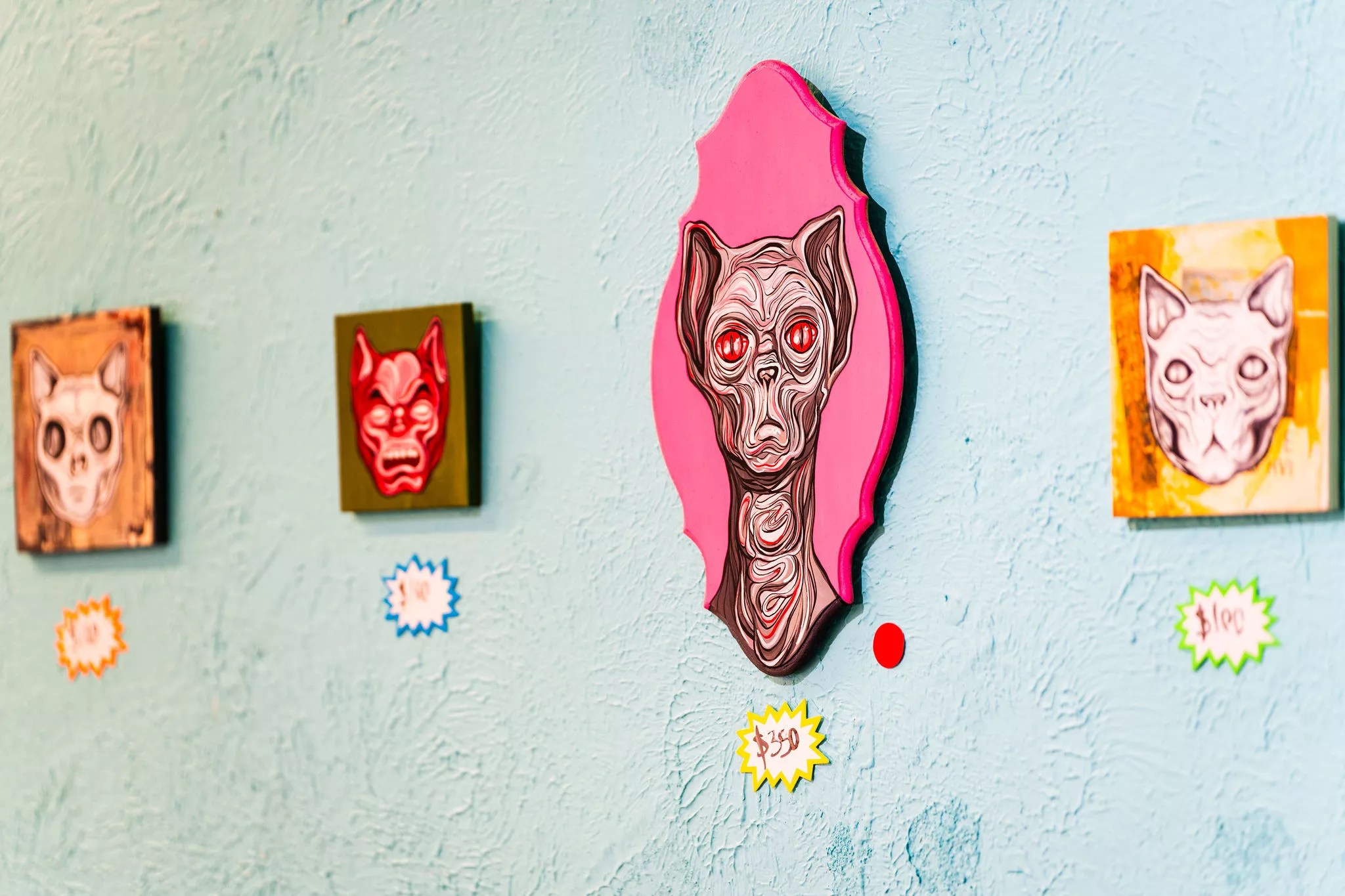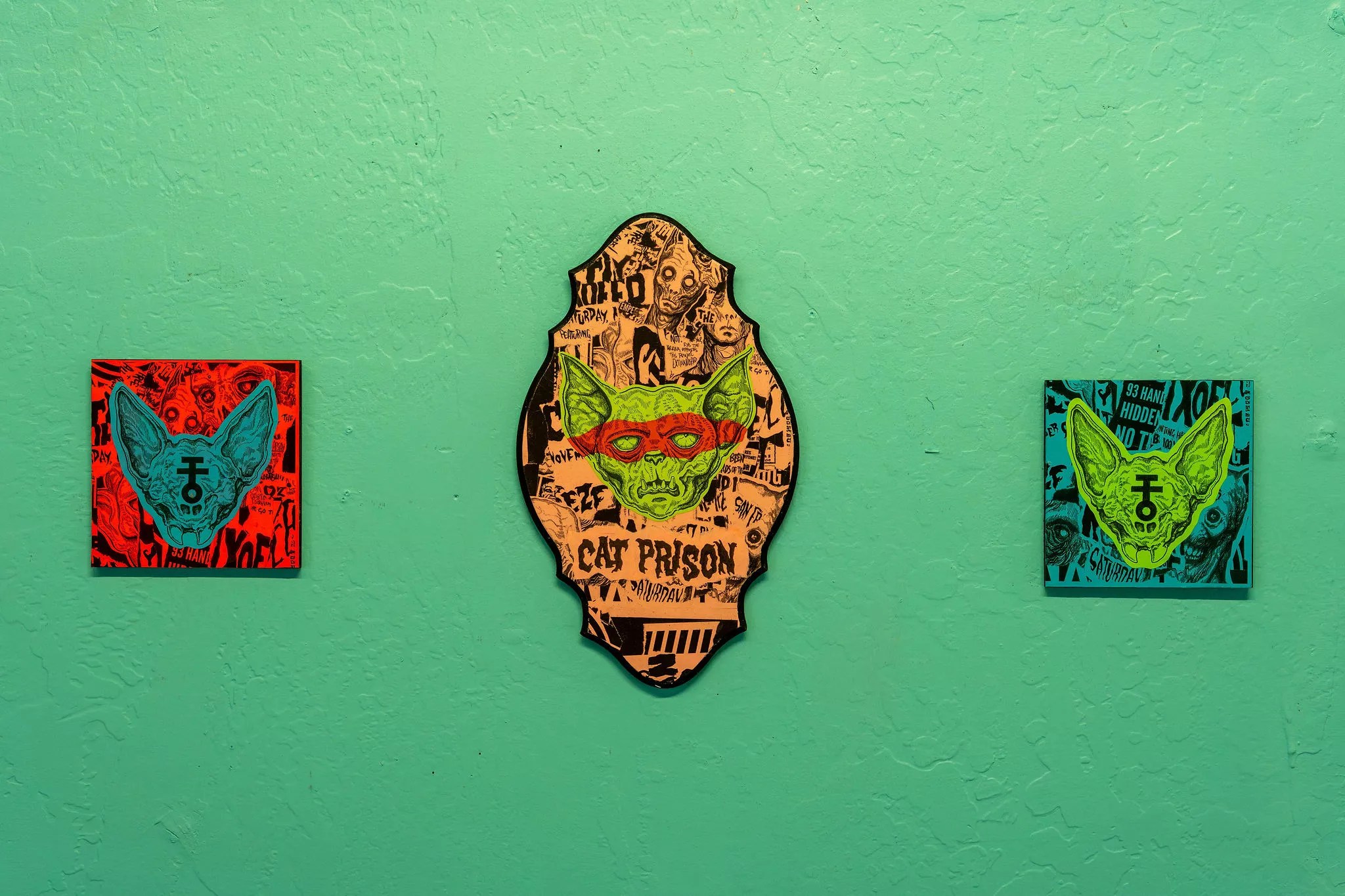 A few steps away, artist James B. Hunt, better known as NXOEED, showed 75 small feline-themed pieces in an exhibition titled “Cat Prison” at Rocket Space Gallery.