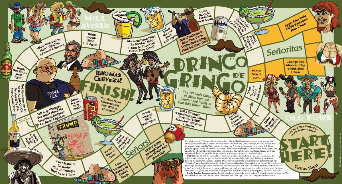 Oh, white people: They sure love turning other cultures’ holidays into an excuse to tie one on. But maybe you don’t wanna take your chances on the streets during Cinco de Mayo, one of the Valley’s favorite amateur-drunk nights? We can’t say we blame ya. A better option might be to host a little house party and play a round of “Drinco de Gringo,” Phoenix New Times’ Cinco-themed board game. You provide the playing pieces (coins will do in a pinch), a die and the various eats and drinks you’ll find mentioned above. We provide the game board; you can download it on our site. Collect your guests’ car keys and enjoy. Luster Kaboom