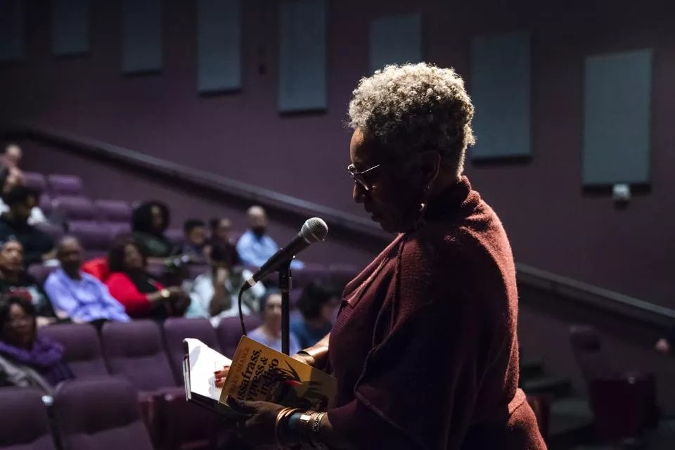 ASU alumna Fatimah Halim speaks at a Project Humanities event honoring late poet Ntozake Shange.