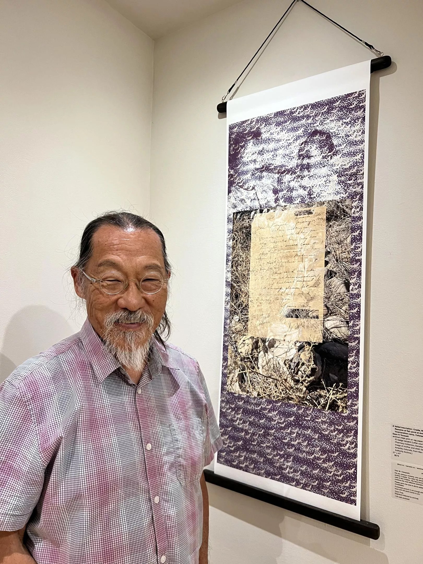 Dean Terasaki poses with a piece from his “Veiled Inscriptions” series, which incorporates letters from people imprisoned in Japanese internment camps into works of art at Eye Lounge.