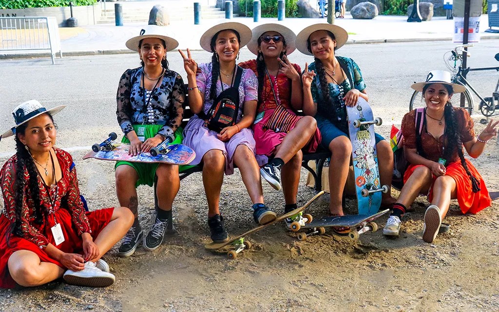A group from Bolivia known as imillaSkate girls showcased their skill in colorful skirts called polleras – outfits imposed in the 16th century by Spanish colonizers, now reclaimed as a badge of Indigenous identity.
